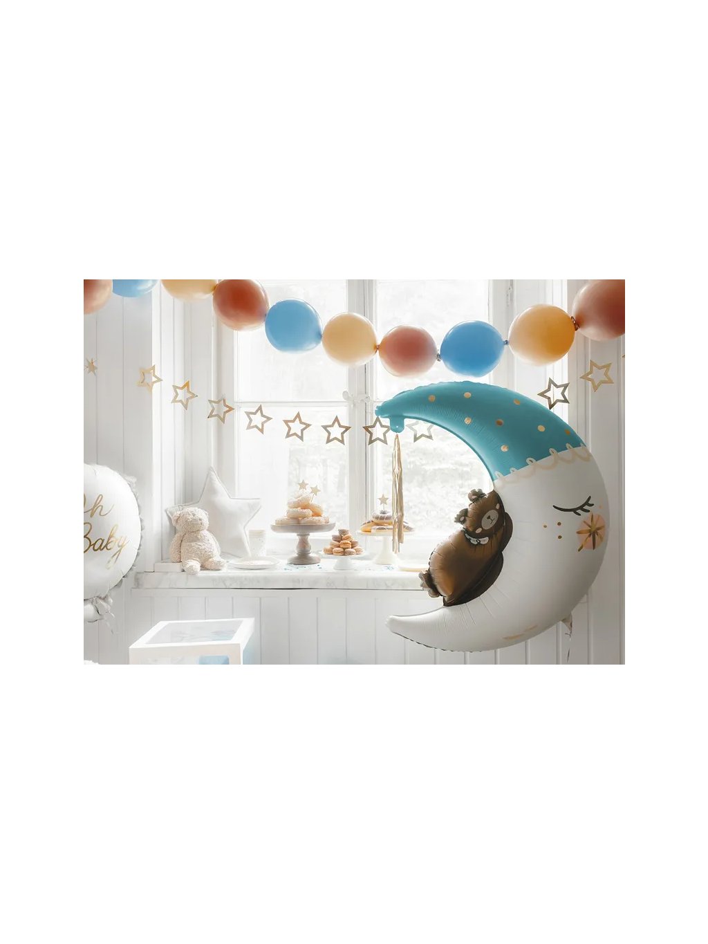 Fóliový balónek medvídek na měsíci, zlaté střapce jsou součístí. Velikost před nafouknutím cca. 80 x 98 cm (31,5 x 38,5''), velikost po nafouknutí cca. 71 x 86 cm (28 x 34''). Nafouknout lze vzduchem nebo heliem. Sada obsahuje brčko pro nafouknutí.