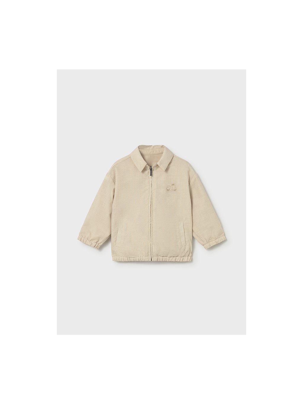Mayoral dětská oboustranná bundička s límečkem.Bunda má zapínání ke krku, na rukávech a v pase je guma. Z obou stran má bunda kapsy. Materiál budičky je velmi příjemný, měkoučký šusťák / bavlna.