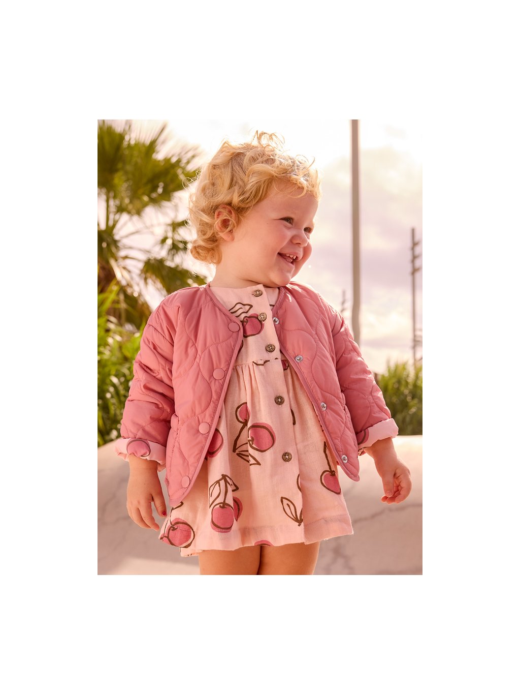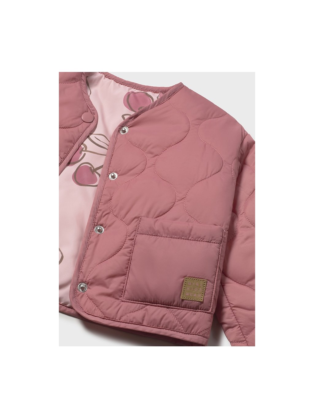 Mayoral dívčí prošívaná oboustranná bundička s motivem třešní. Bunda je z velmi příjemného, lehoučkého materiálu, zapínání je na cvoky.