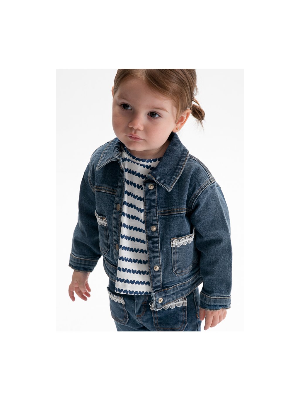Mayoral dívčí odlehčená riflová bundička s kapsičkami a aplikací. Bunda je z velmi příjemného, odlehčeného materiálu, na přední straně jsou cvoky. Délka bundy je do pasu.