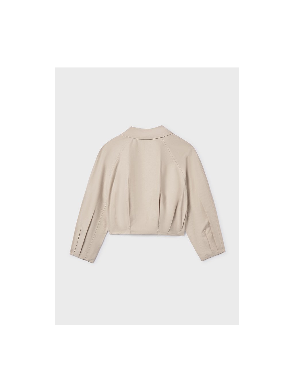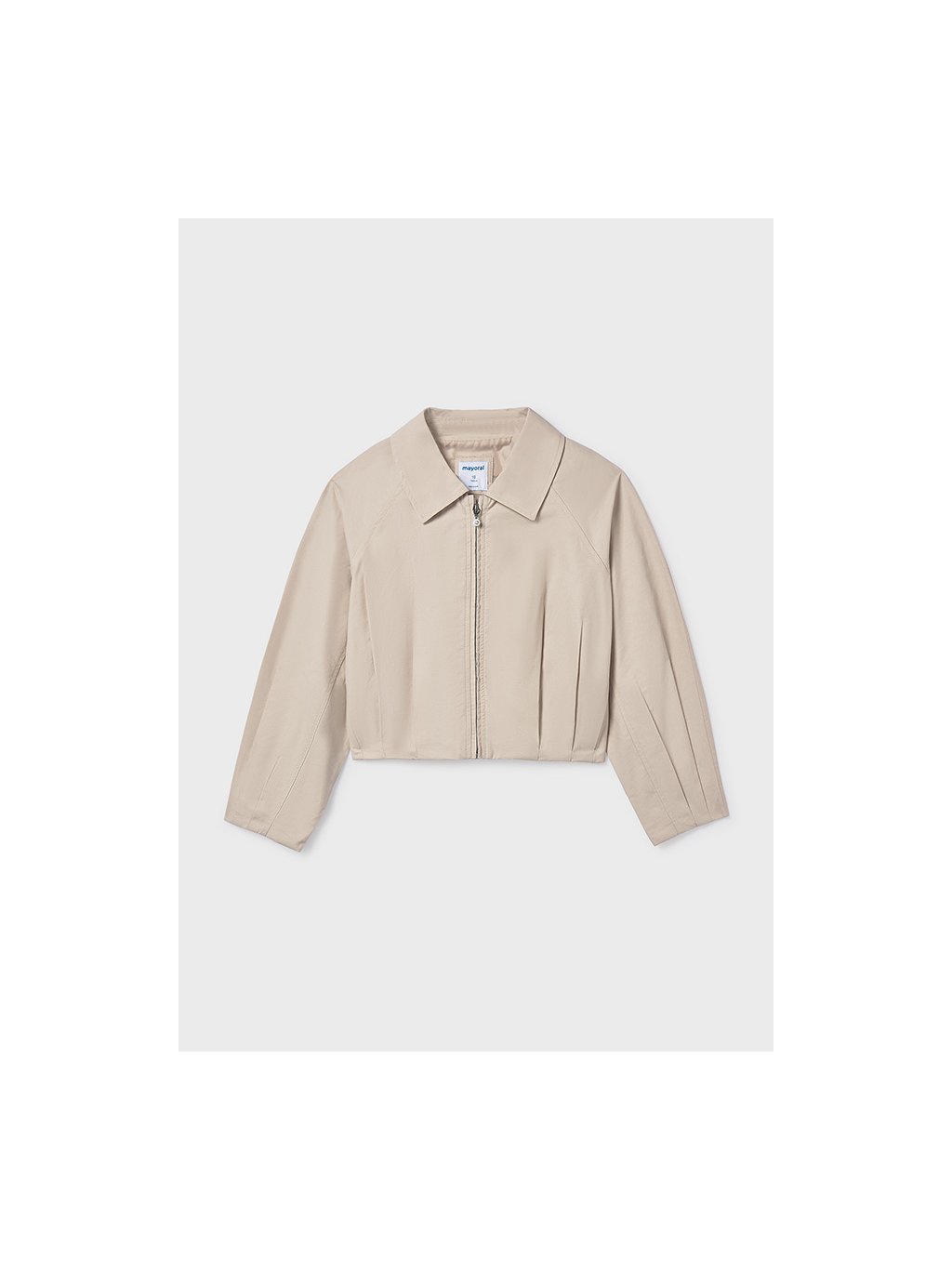 Mayoral dívčí béžová bundička s límečkem do pasu. Bundička má zapínání na přední straně na zip. Na zadní straně pod límečkem je decentní logo.