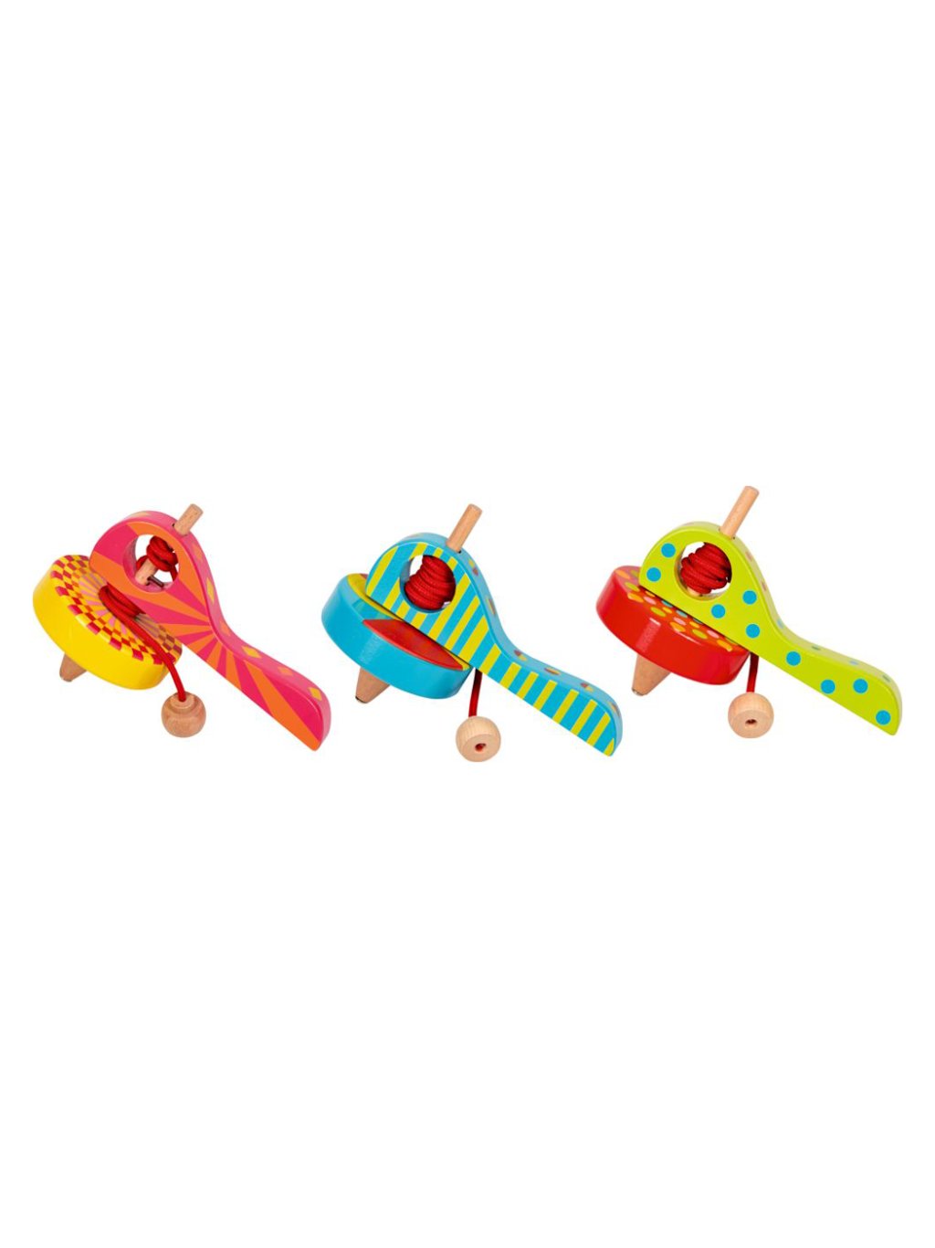 Dřevěná veselá káča s rukojetí. Jednoduše zatáhněte za šňůrku a barevná dřevěná káča odletí. Skvělá zábava je zaručena! Dostupné ve 3 provedeních.
