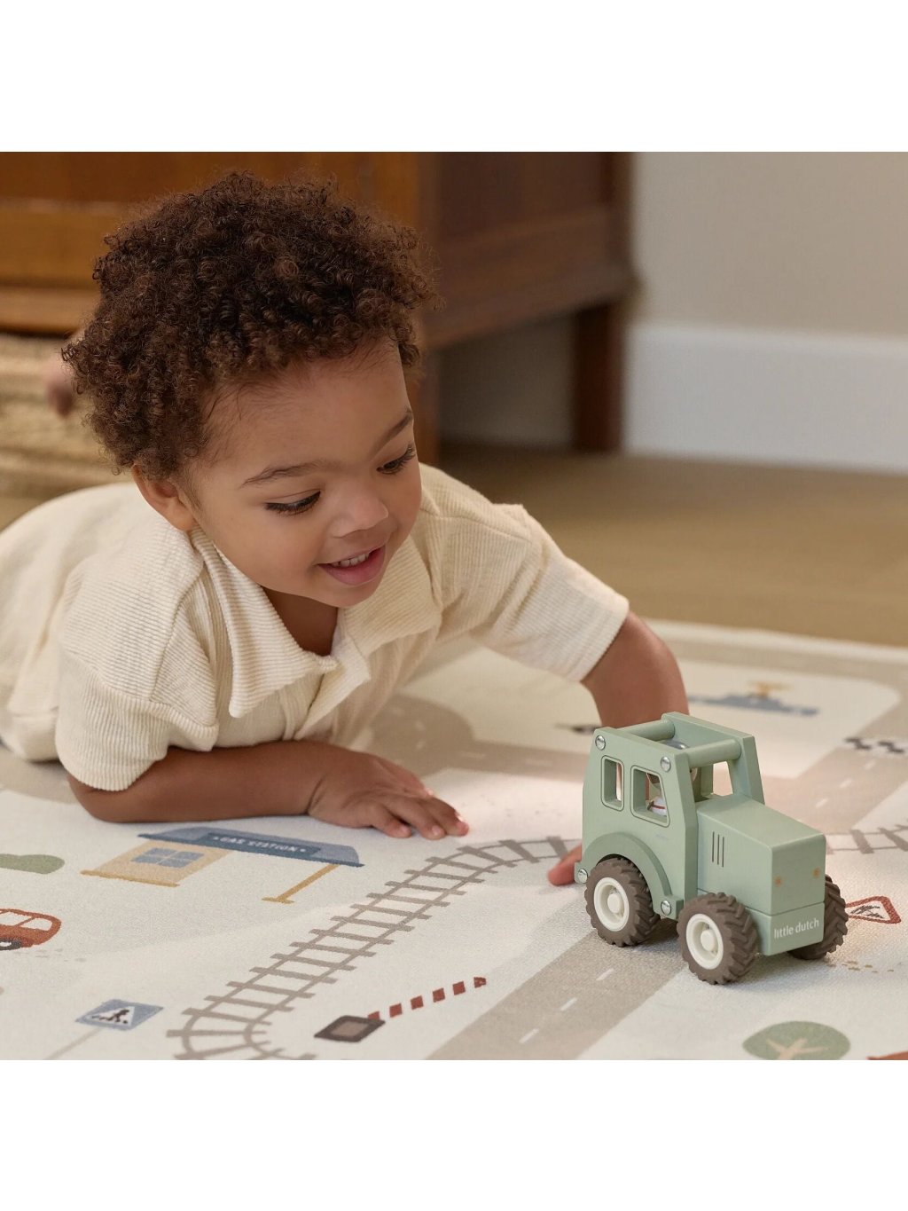 Vydejte se společně za dobrodružstvím s tímto dřevěným traktorem. Jemná zelená barva a přátelský farmář lákají k nekonečné zábavě při hraní. Ideální pro kombinování s dalšími vozidly pro ještě větší fantazii.