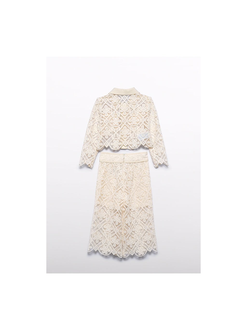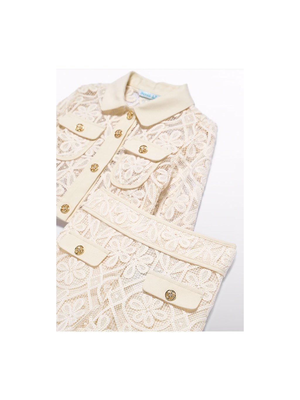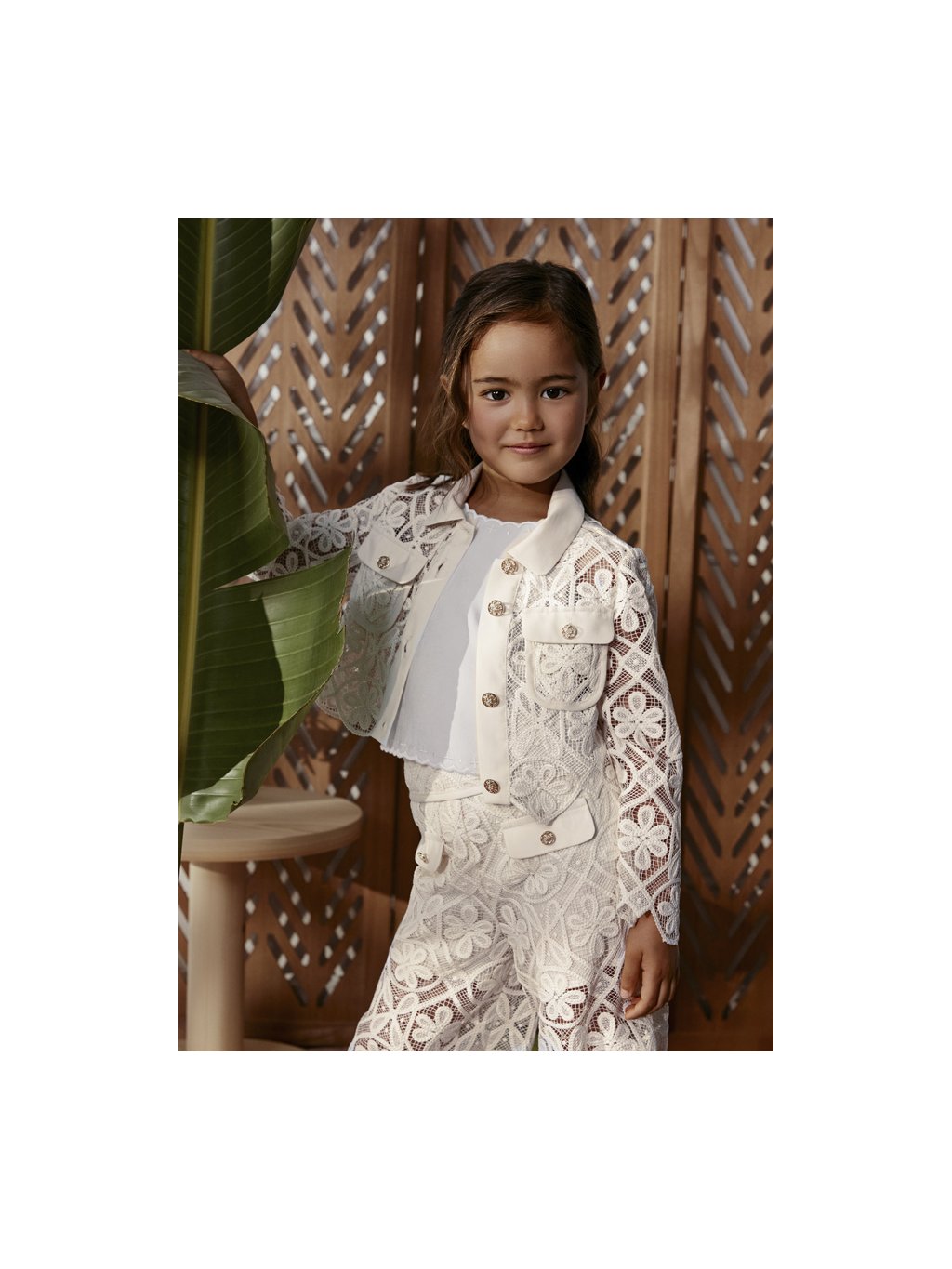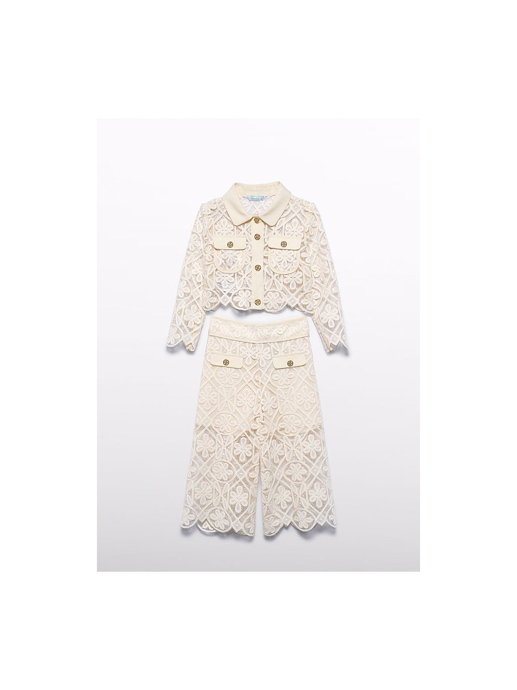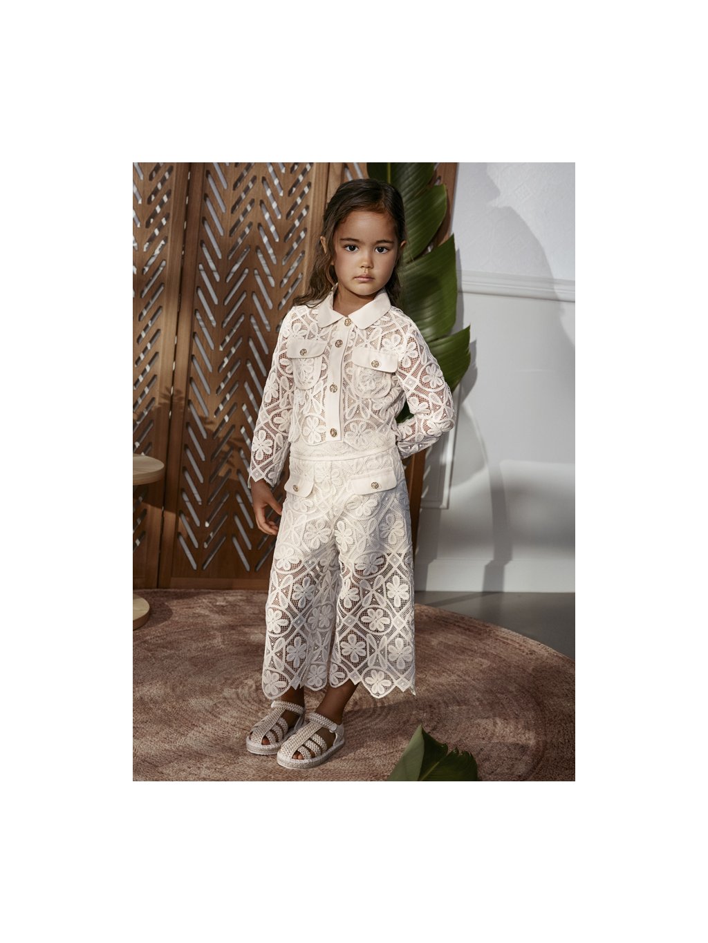 Luxusní dívčí háčkovaný set košile a kalhot. Košile má zapínání na přední straně na knoflíčky, u krku je límeček. Kalhoty mají široké nohavice, jsou podšité kraťásky. Kalhoty mají zapínání na zadní straně na neviditelný zip.