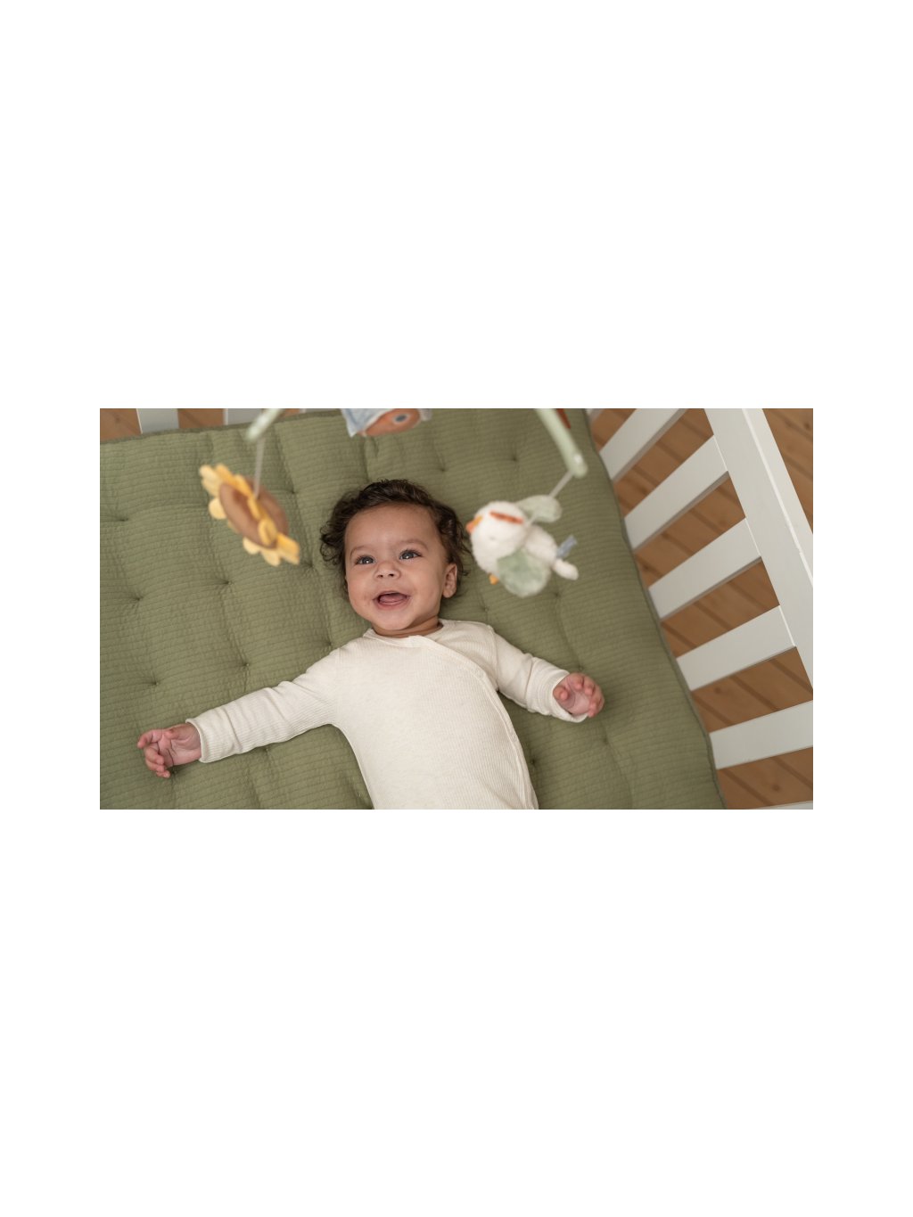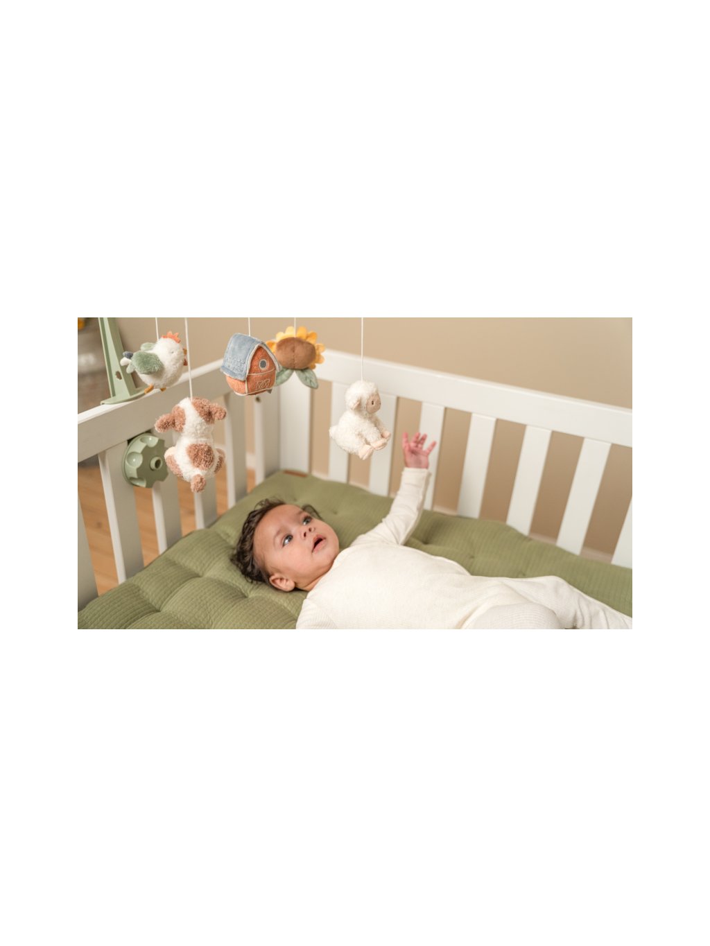 Kolotoč s natahovacím hudebním boxem hraje něžnou ukolébavku pro klidné usínání. Pozornost dítěte upoutají otáčející se plyšové hračky v podobě ovečky, slepičky, kravičky, slunečnice a domečku. Kolotoč snadno připevníte na bočnici postýlky.