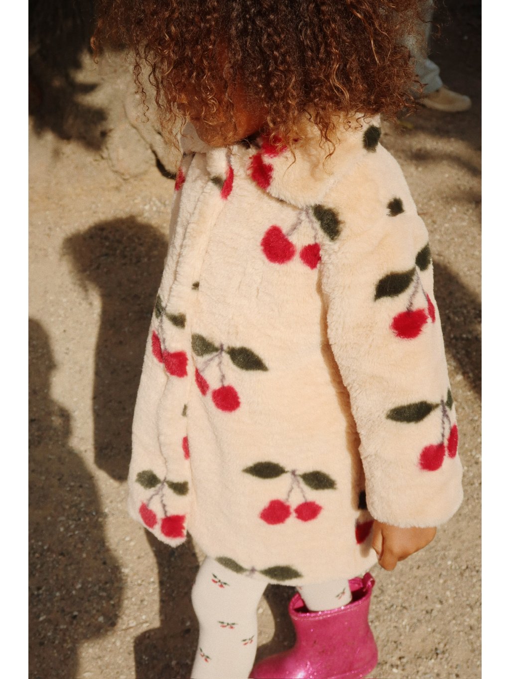 Dívčí heboučký kabátek s motivem třešniček, kulatým límcem a zapínáním na patenty. Kabát má na přední straně dvě funkční kapsy. Kabát má volnější střih. Kabát lze nosit jak na podzim, tak ale i na zimu.
