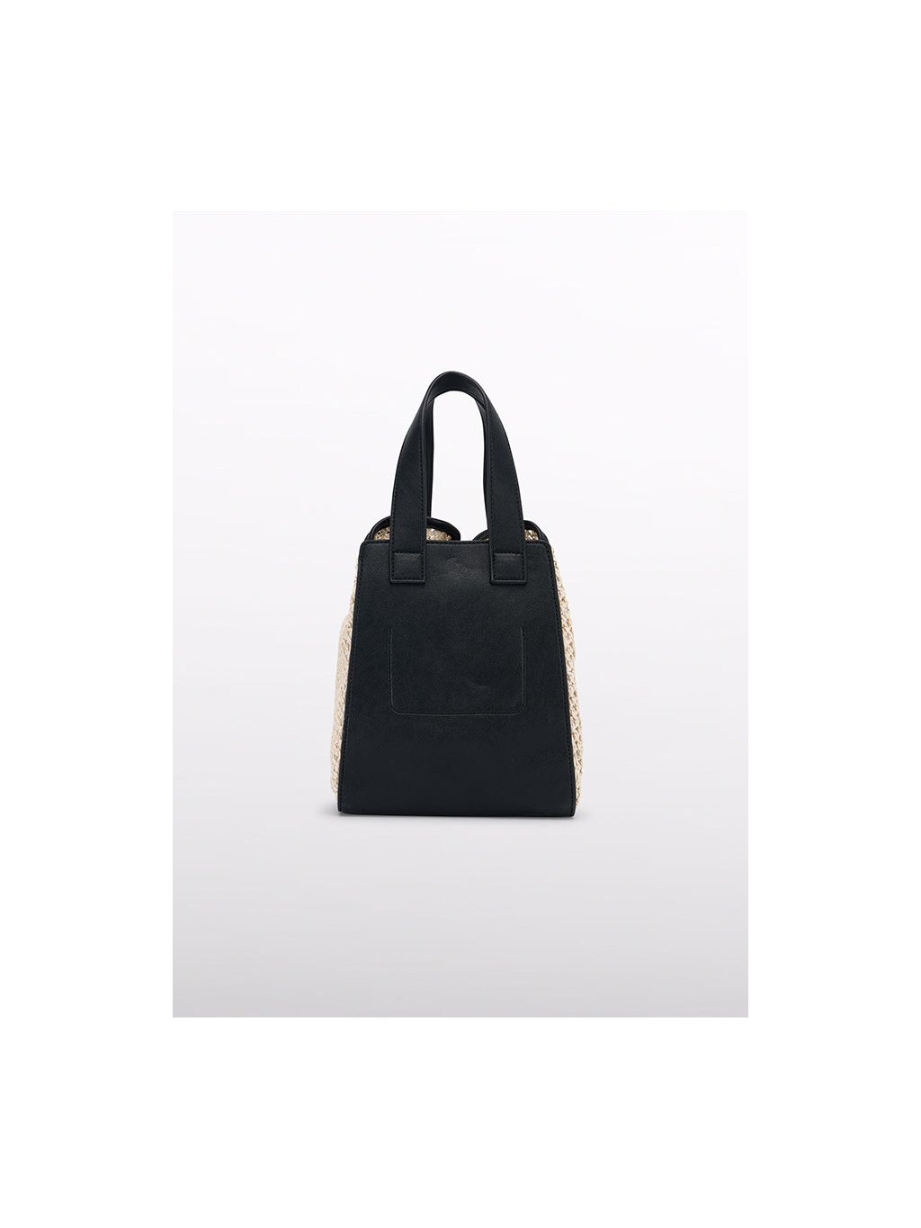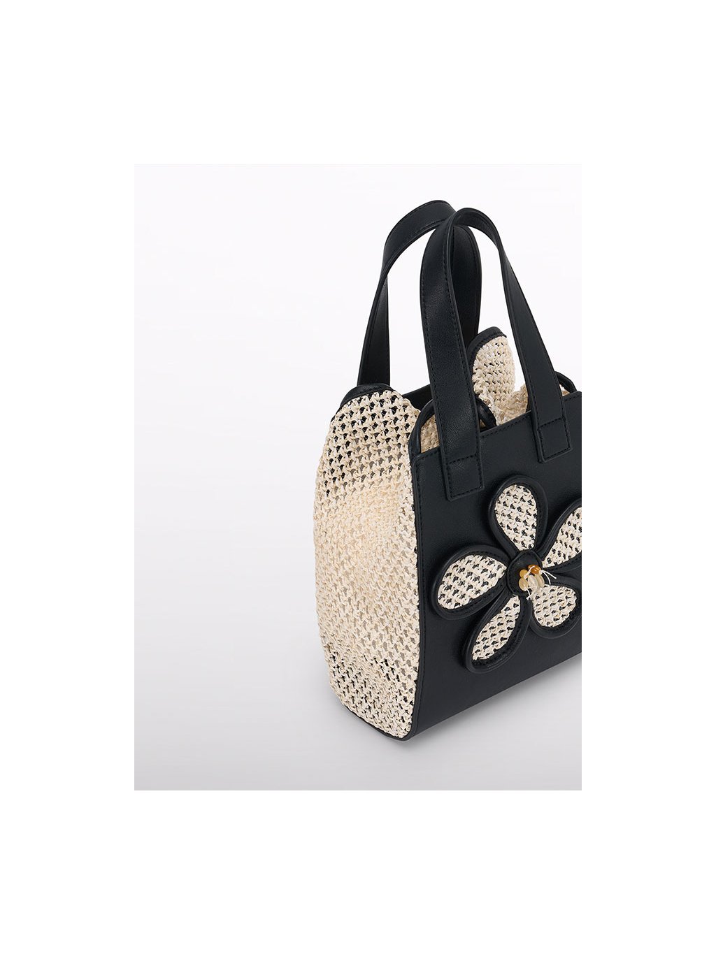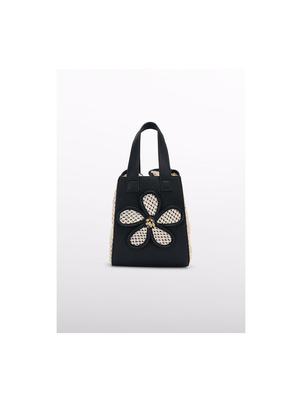 Háčkovaná kabelka do ruky s koženkovými detaily. Kabelka je celá háčkovaná, na přední a zadní straně má koženkové detaily. Na přední straně je zajímavě řešená s motivem kytky.