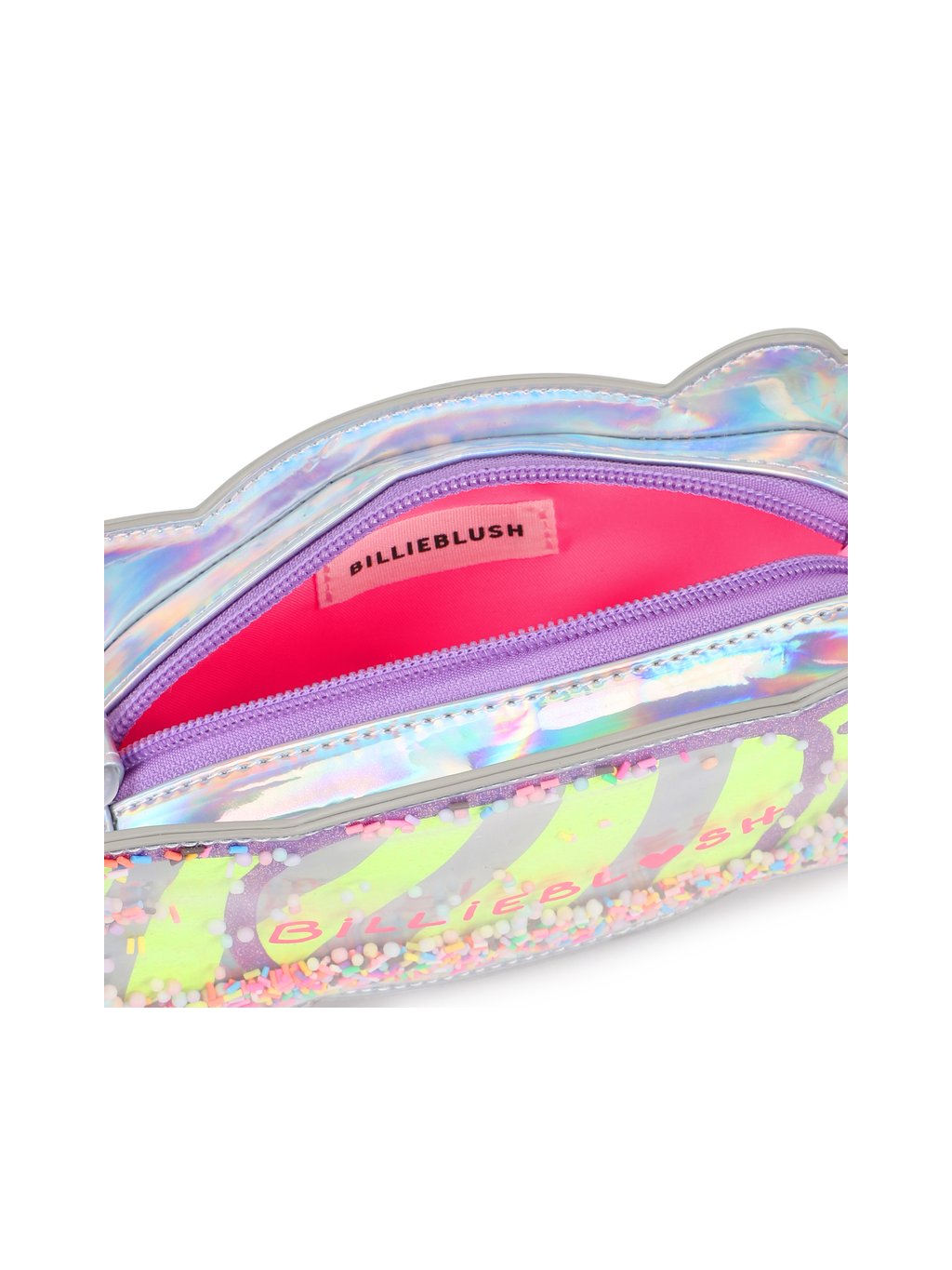 Sladké na nošení: tato taška BILLIEBLUSH rozjasní každý outfit hravým nádechem. Lesklá textilie s odlesky skrývá pod průhledným materiálem konfety s ilustrací třpytivých a fluorescenčních bonbónů. Barevný plastový řetízkový ramenní popruh a zapínání na zip zajišťují styl a praktičnost. Kompaktní a hravá taška.