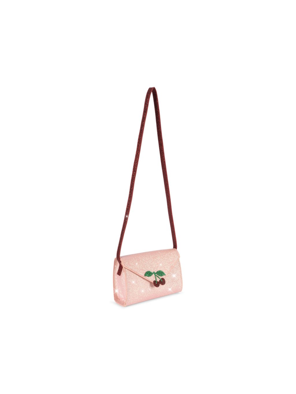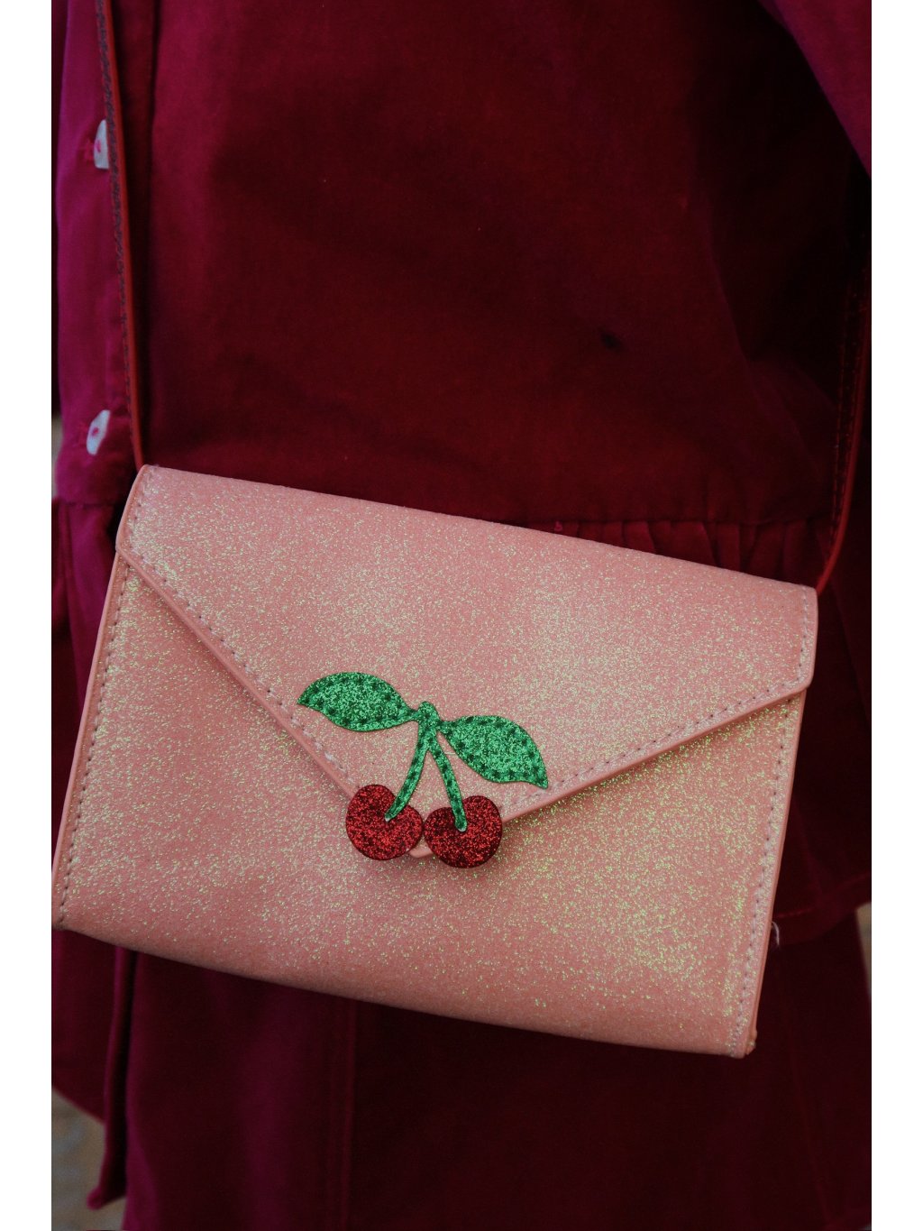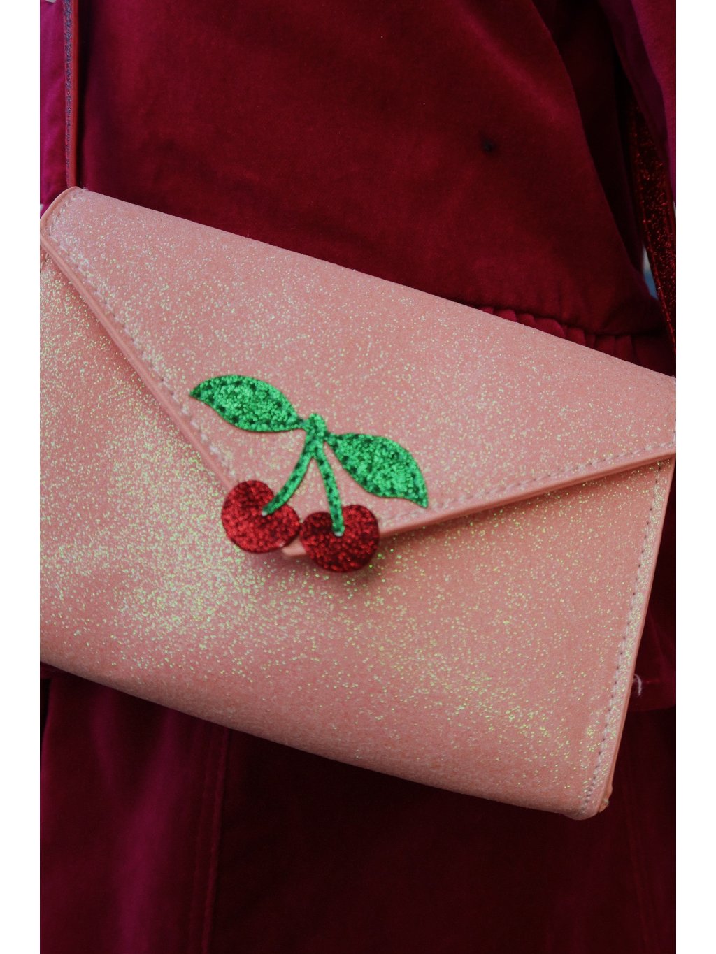 Krásná třpytivá kabelka se zapínáním na cvok na přední straně. Kabelka má dlouhý ramenní popruh a na přední straně je ikonická třešnička. Vyrobeno ze 100% polyesteru s podšívkou ze 100% bavlny.
