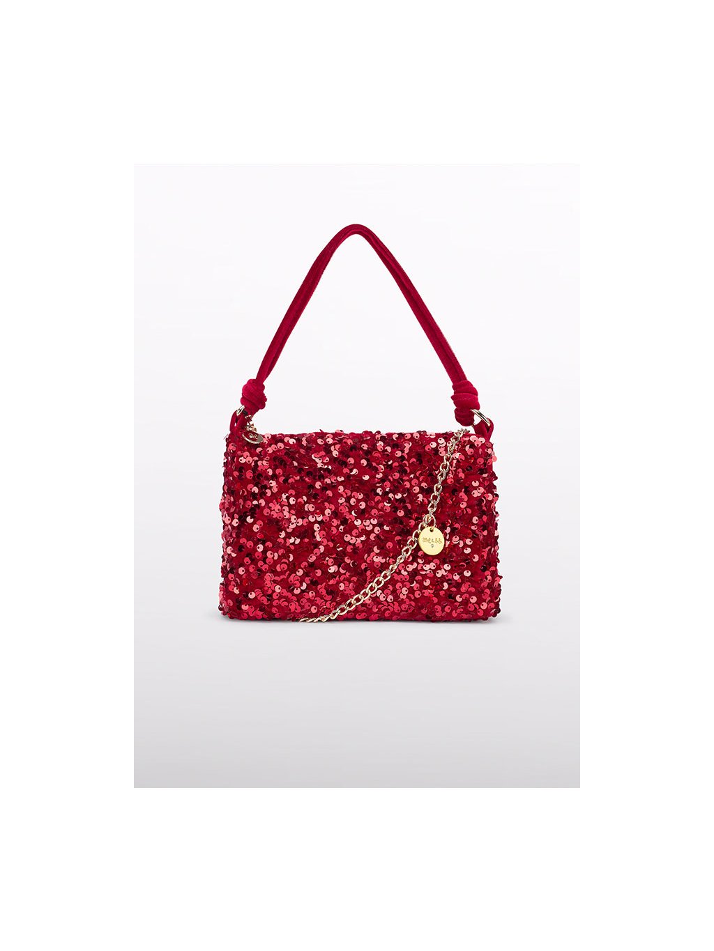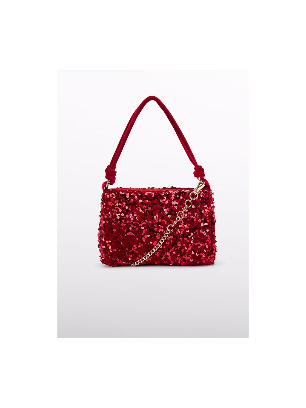 Luxusní dívčí červená kabelka s flitry. Kabelka má odepínací dlouhý zlatý řetízkový popruh, zapínání je na zip.