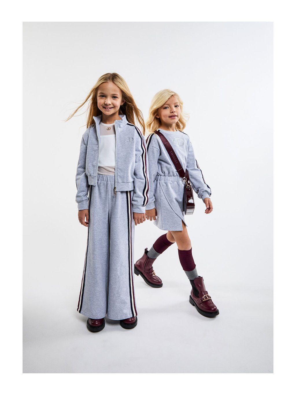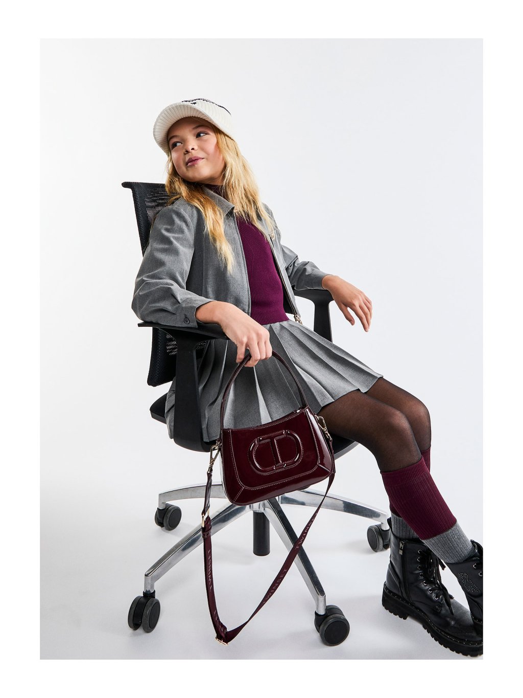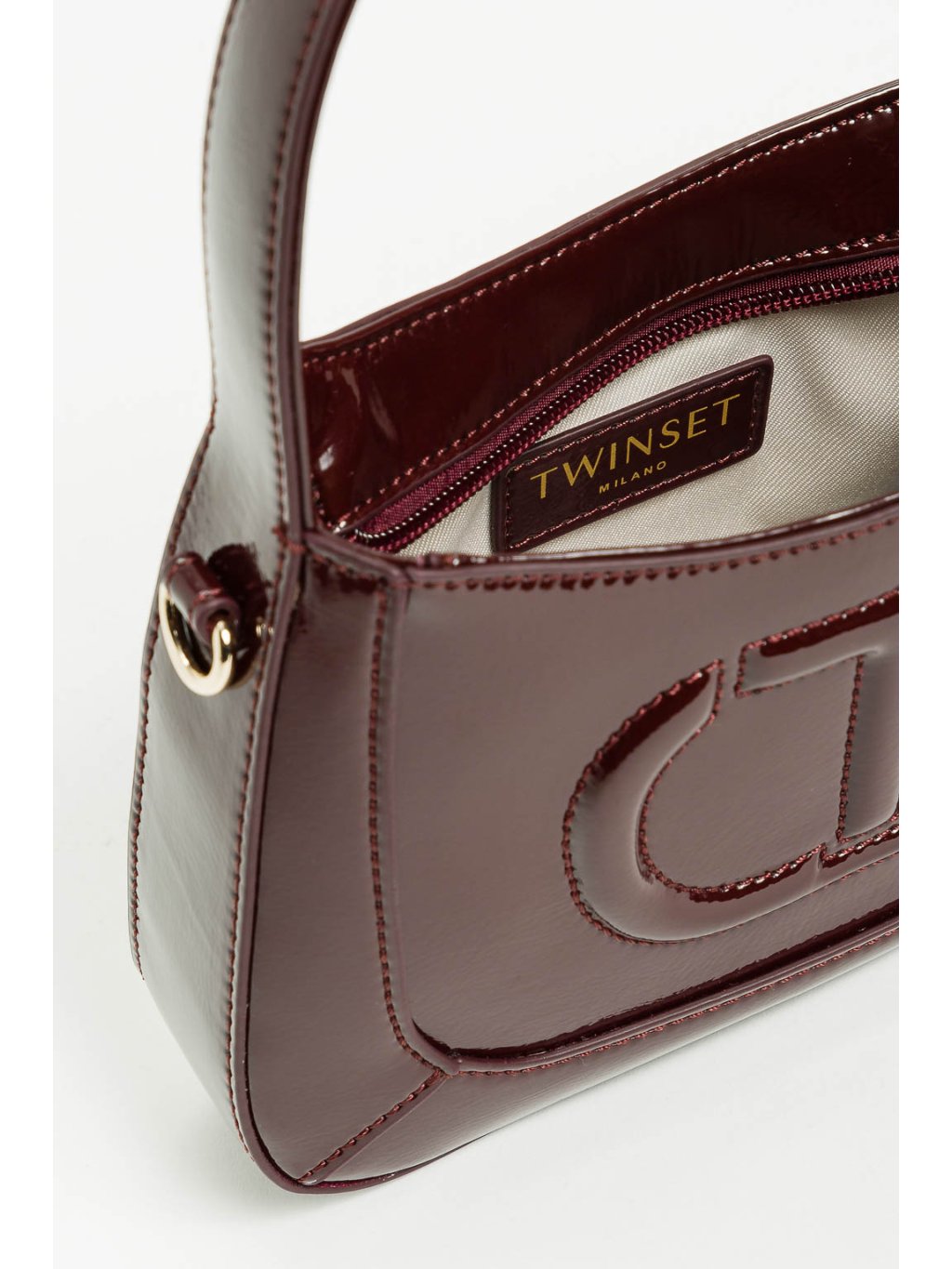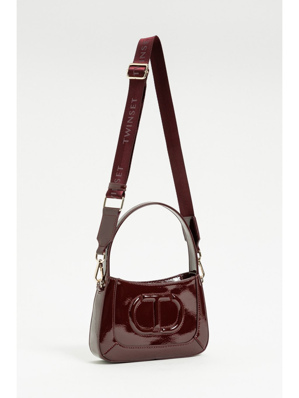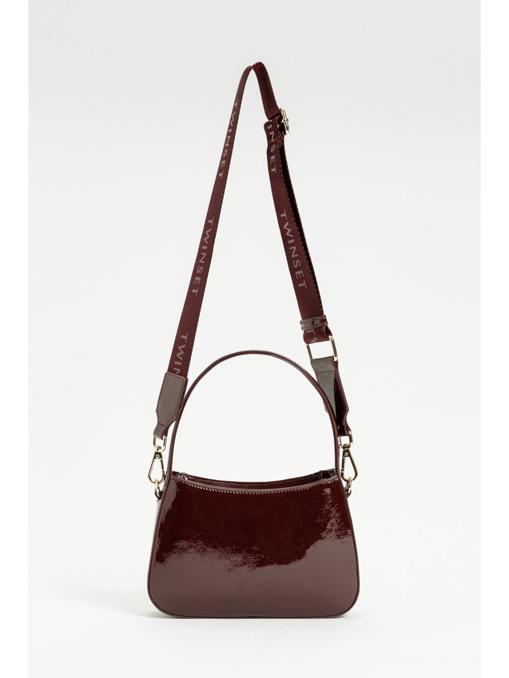 Lesklá dívčí vínová kabelka s logem.