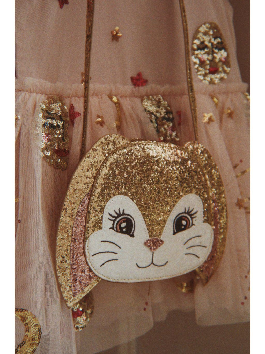 Krásná třpytivá kabelka ve tvaru zaječí hlavičky. Kabelka má dlouhý ramenní popruh a zapínání na zip. Vyrobeno ze 100% polyesteru s podšívkou ze 100% bavlny.