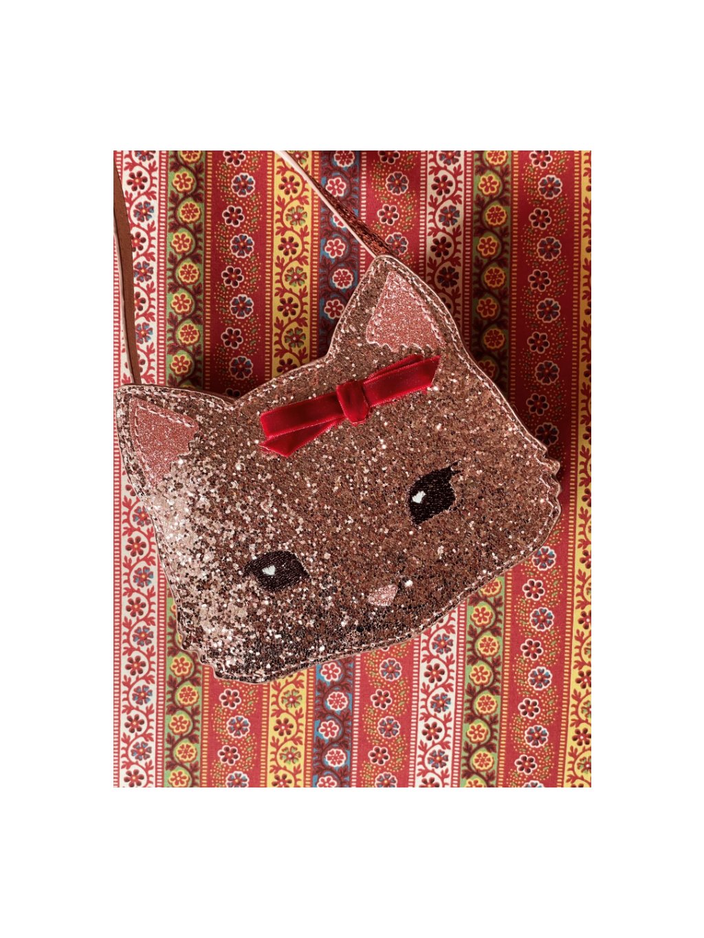 Krásná třpytivá kabelka ve tvaru kočičí hlavičky. Kabelka má dlouhý ramenní popruh a zapínání na zip. Vyrobeno ze 100% polyesteru s podšívkou ze 100% bavlny.