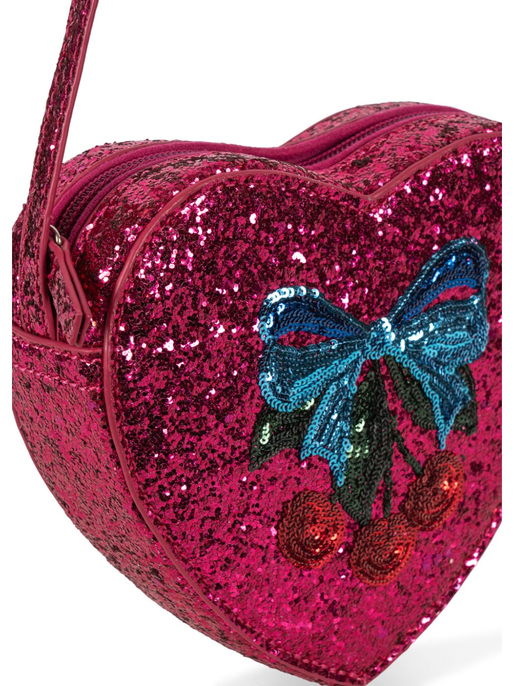 Krásná třpytivá kabelka ve tvaru srdce a výšivkou třešničky. Kabelka má dlouhý ramenní popruh a zapínání na zip. Vyrobeno ze 100% polyesteru s podšívkou ze 100% bavlny.