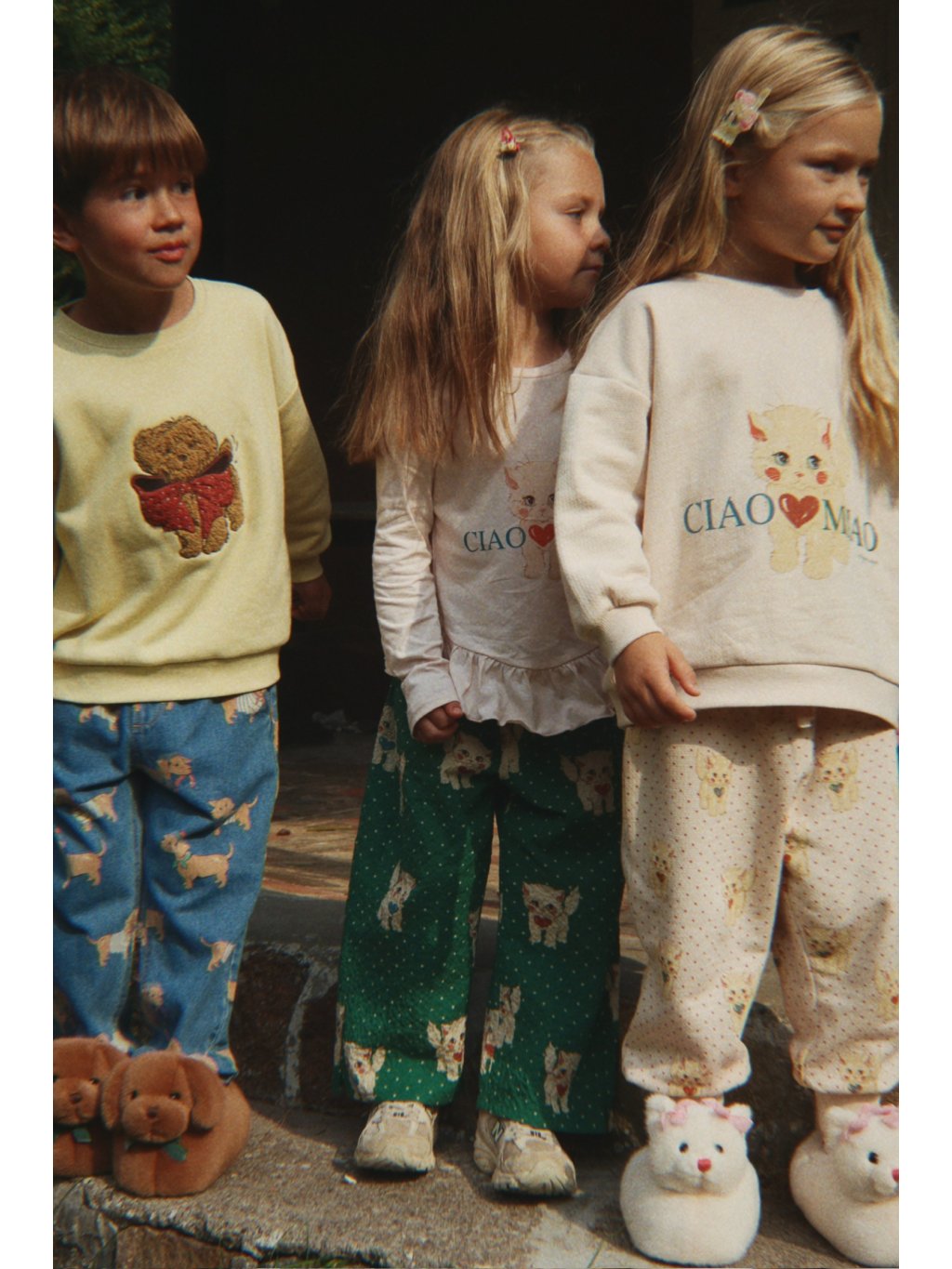 Dívčí bavlněné natahovací kalhoty s motivem pudlíků. V pase je pružná měkká guma. Kalhoty jsou volnějšího střihu.