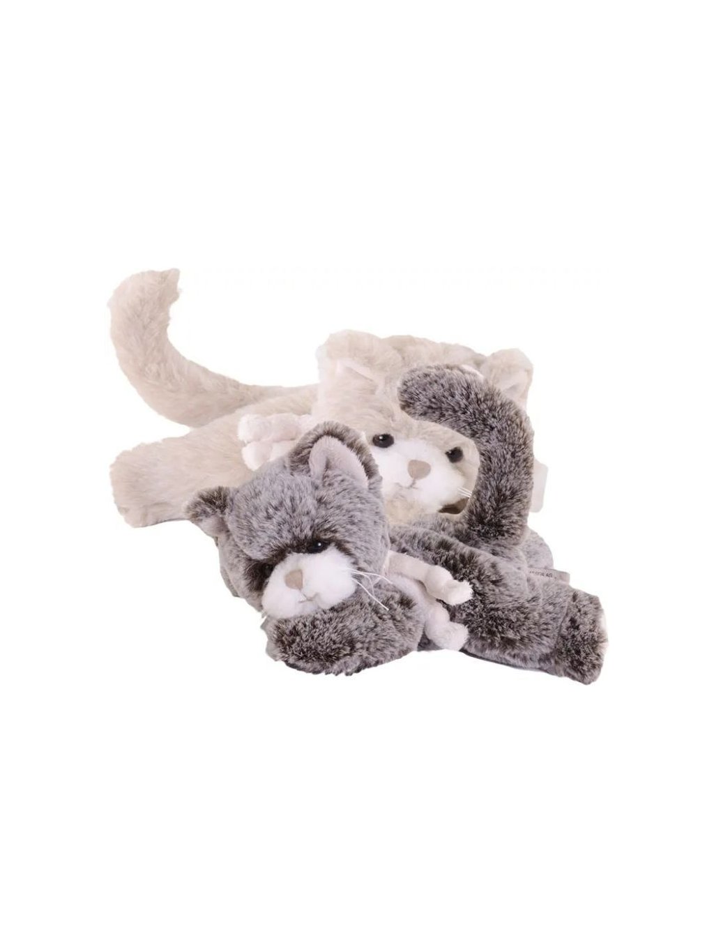 Malá šedo-mourovatá kočička. Kočička leží a okolo krku má bílou stuhu. Kočička je z velmi příjemného a heboučkého materiálu.