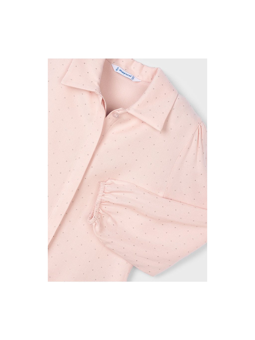 Mayoral dívčí košile s dlouhým rukávem a stříbrnými puntíky. Košile je z nádherného, heboučkého materiálu, zapínání je na přední straně na knoflíčky. Na konci rukávů jsou gumičky.