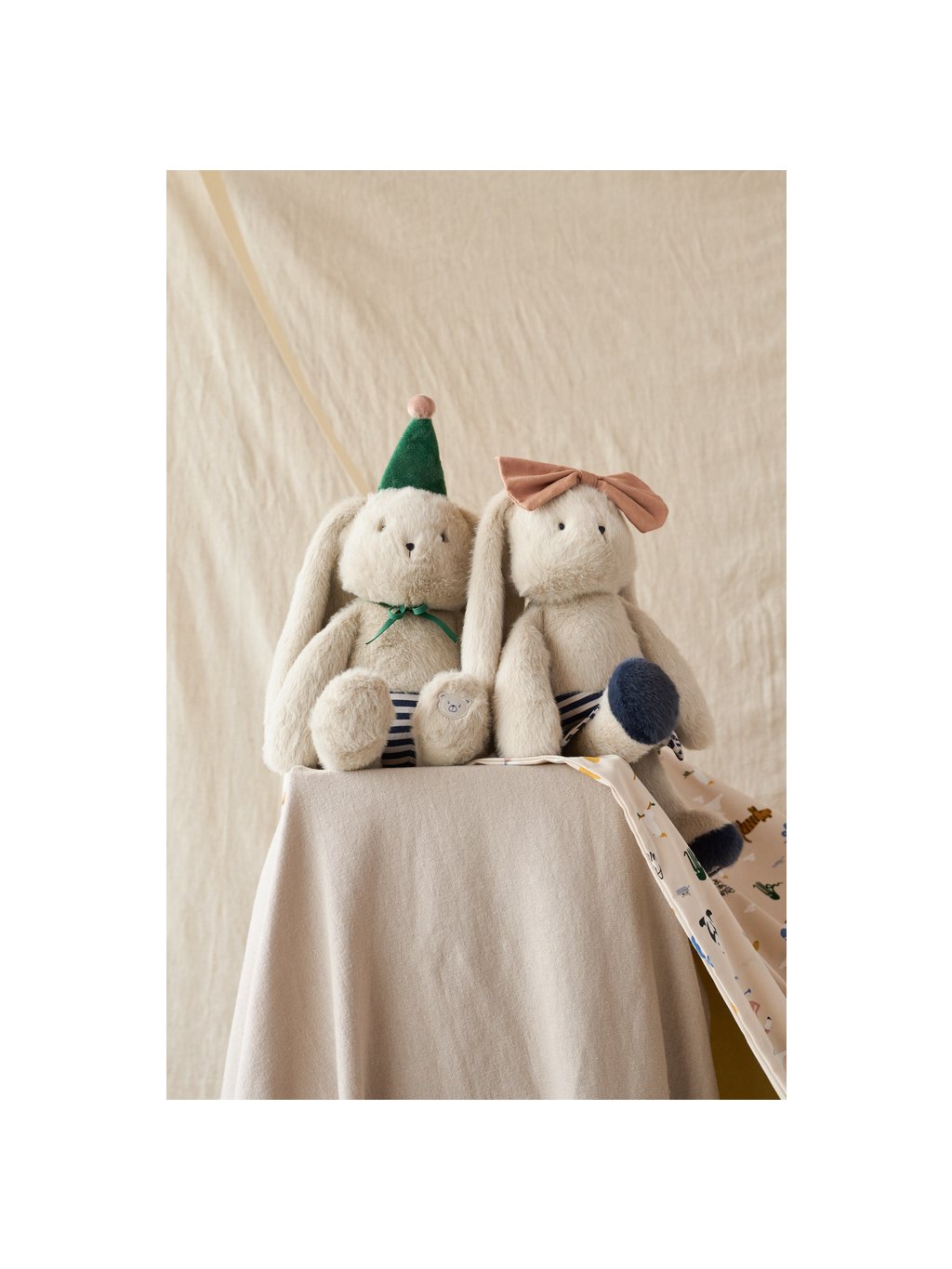 Nádherný heboučký králíček se zelenou čepičkou. Plyšový medvěd je z ultra jemného, měkkého plyše, na nožičce má decentní výšivku.