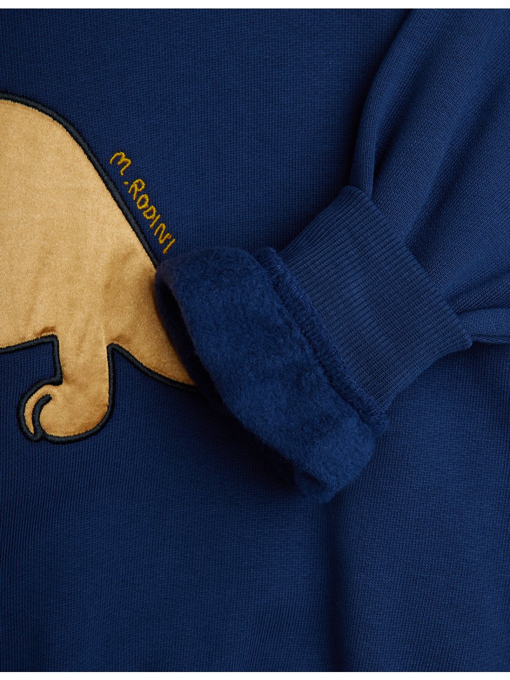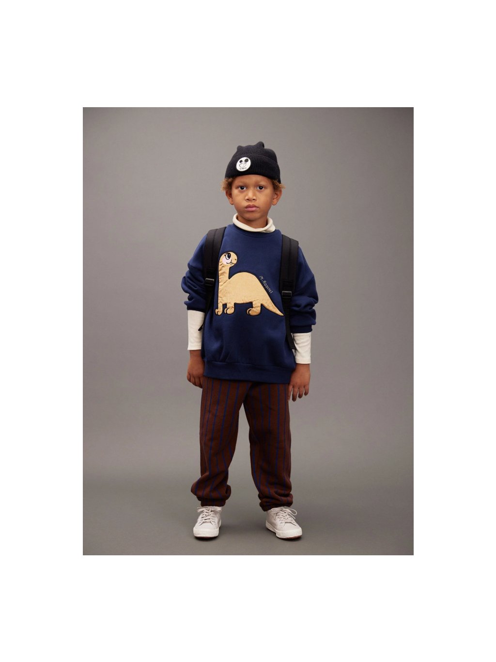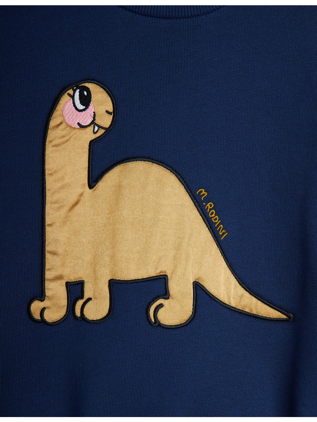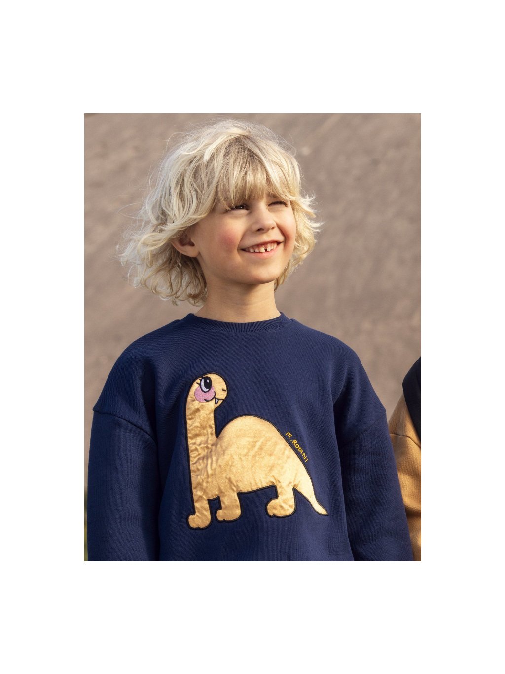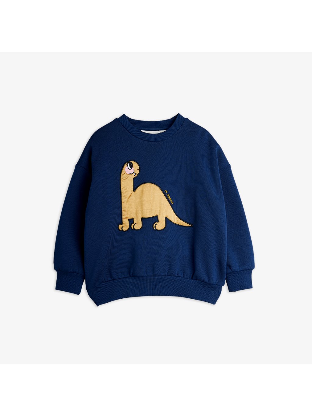 Dětská mikina s dinosaurem z organické bavlny. Mikina má u krku kulatý výstřih, na přední straně na prsou je aplikace velkého dinosaura. V pase a na rukávech jsou manžety.