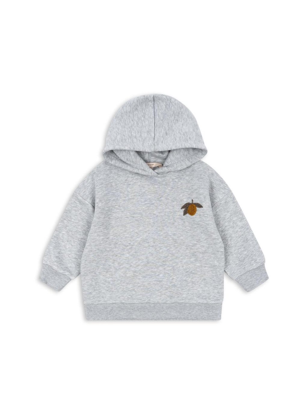 Jednobarevná mikina s kapucí přes hlavu. Mikina má u krku kulatý výstřih, na levém prsu je aplikace citrónku. V pase a na rukávech má mikina manžety.