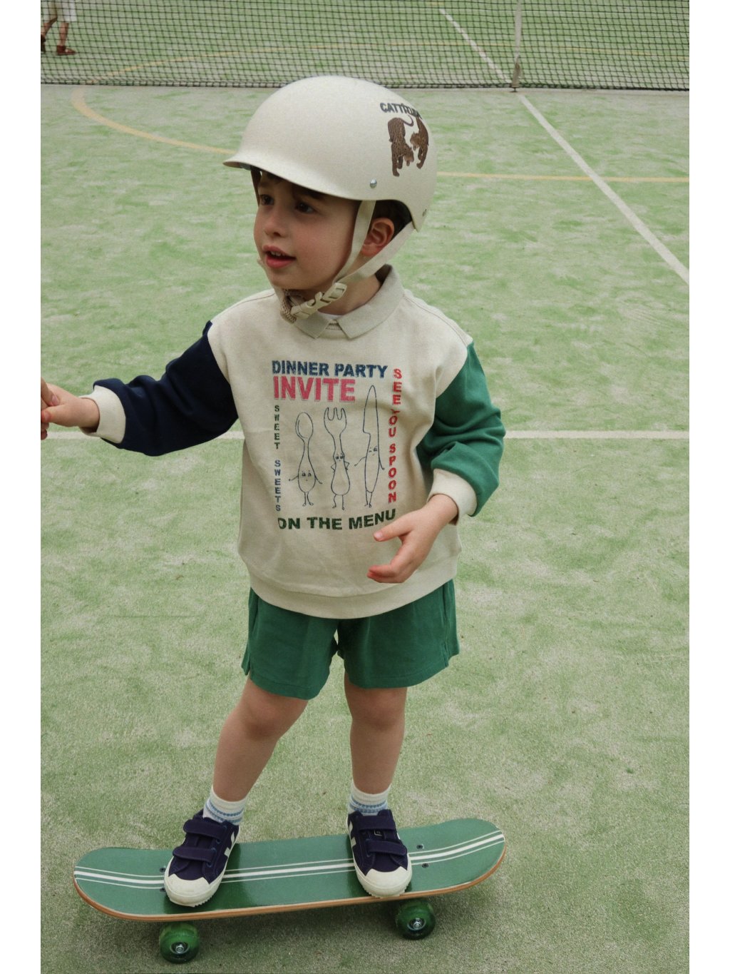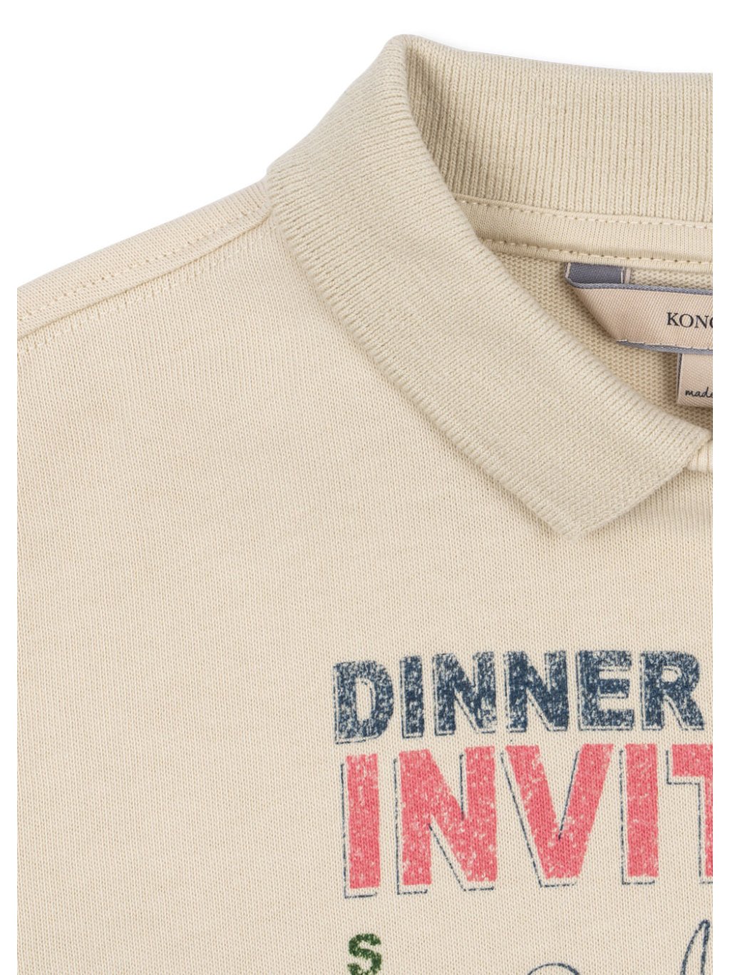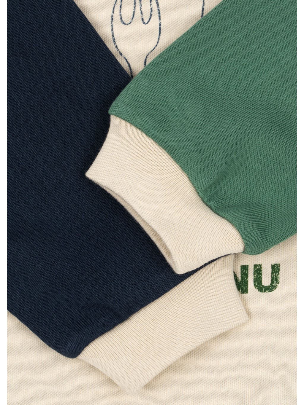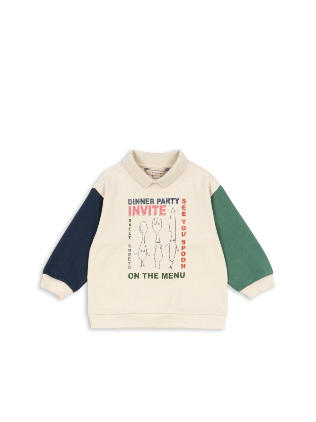 Mikina Konges Slojd přes hlavu s límečkem a vtipným tiskem na přední straně. Mikina má u krku kulatý výstřih s límečkem. Na rukávech a v pase jsou manžety. Rukávy jsou dvoubarevné.