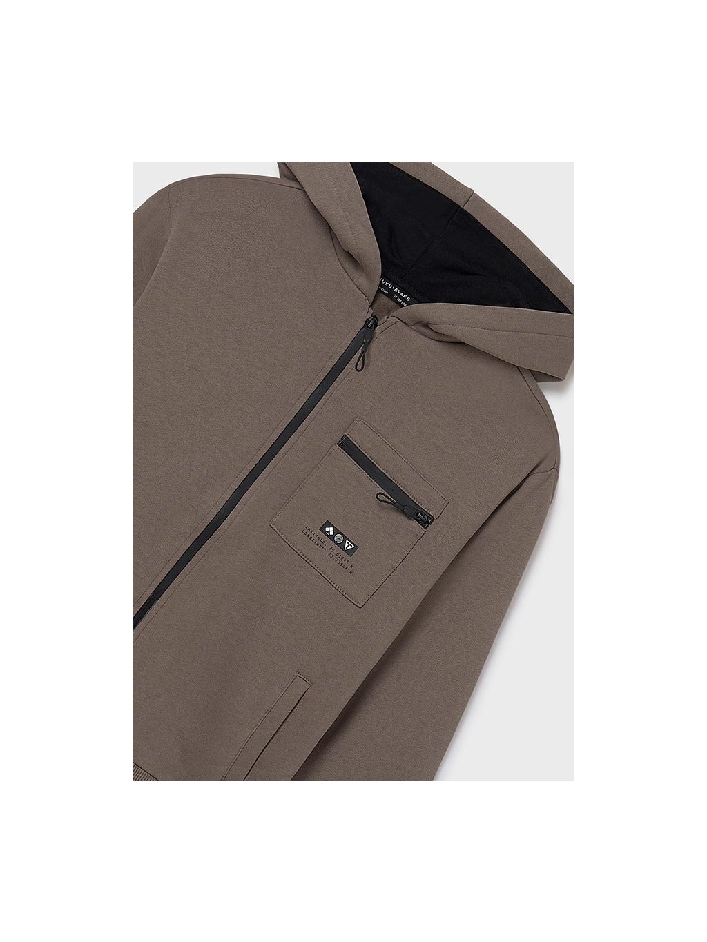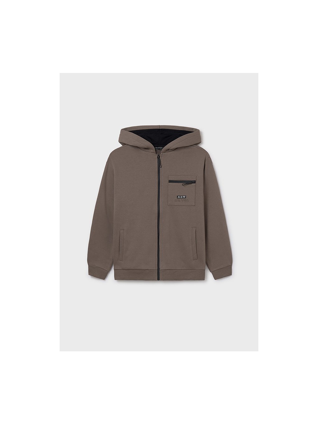 Mayoral chlapecká mikina na zip s kapucí. Mikina je z velmi příjemného materiálu. Mikina má na přední straně rozepínání a tři kapsy. Na levém prsu je kapsička nejmenší, na ni je decentní tisk. V pase a na rukávech jsou manžety.