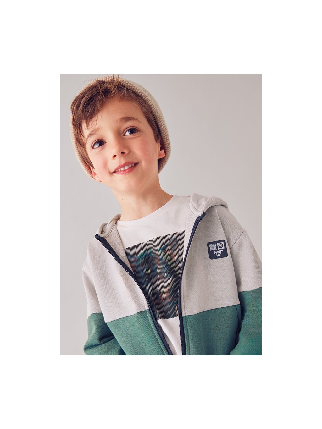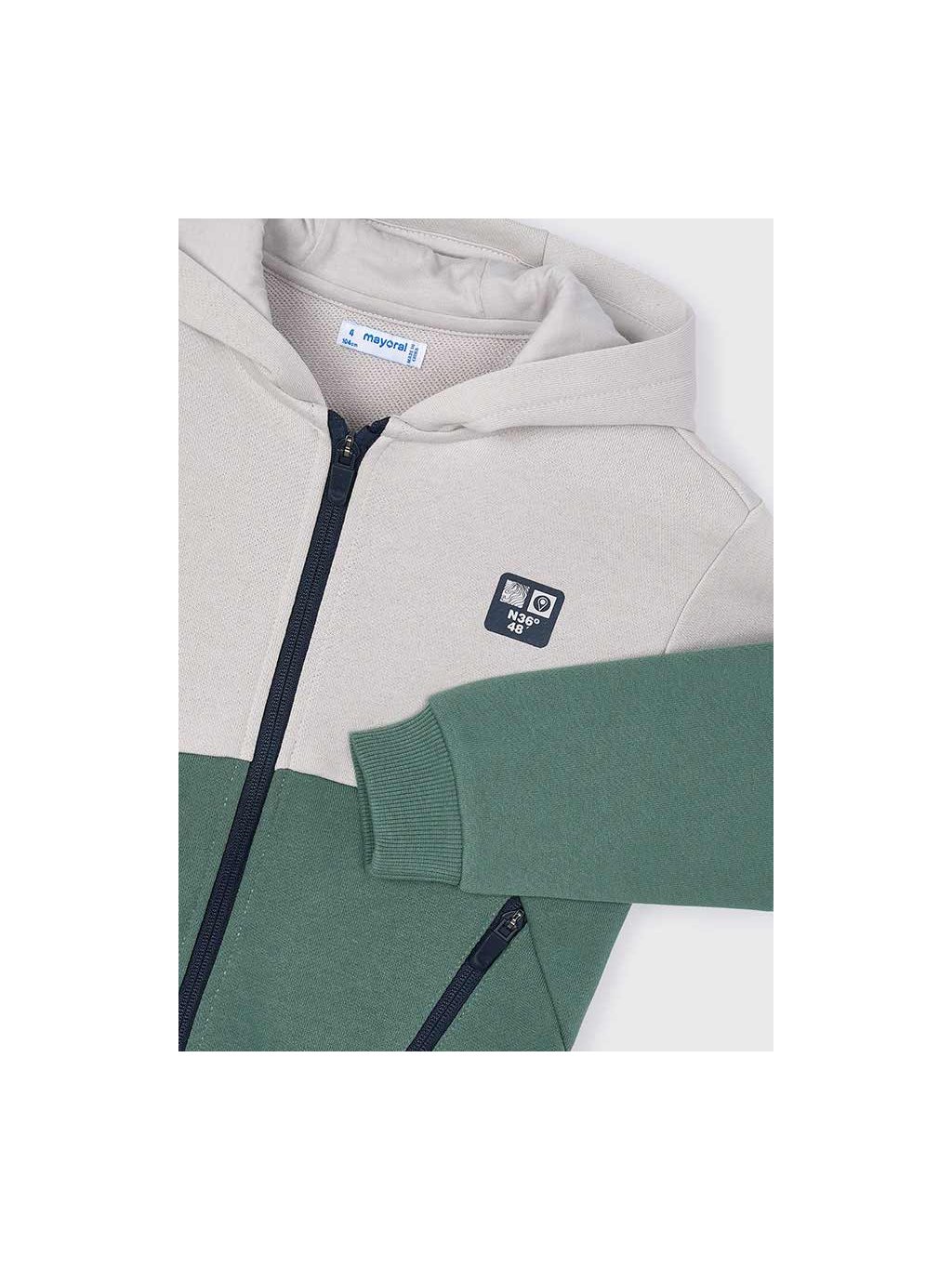 Mayoral chlapecká mikina s kapucí. Mikina má na přední straně zip a dvě funkční kapsy, na levém prsu je tisk. Mikina je z příjemného materiálu. Na rukávech a v pase jsou manžety.