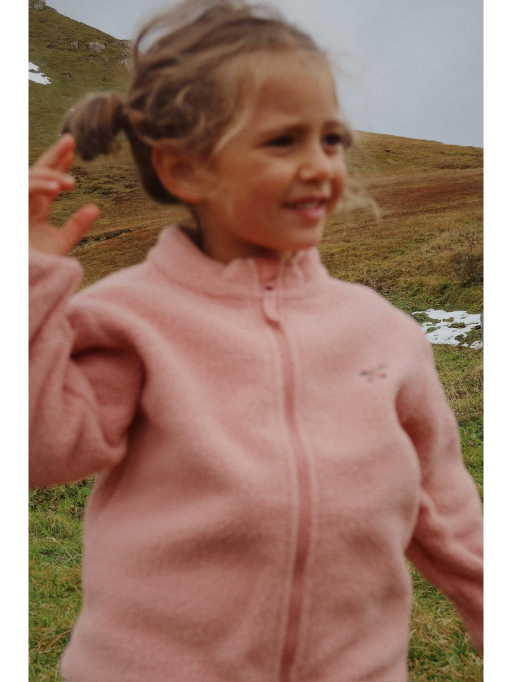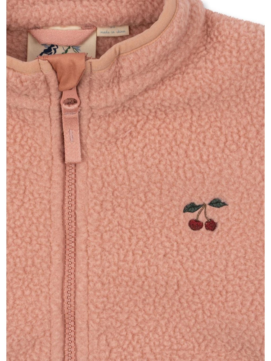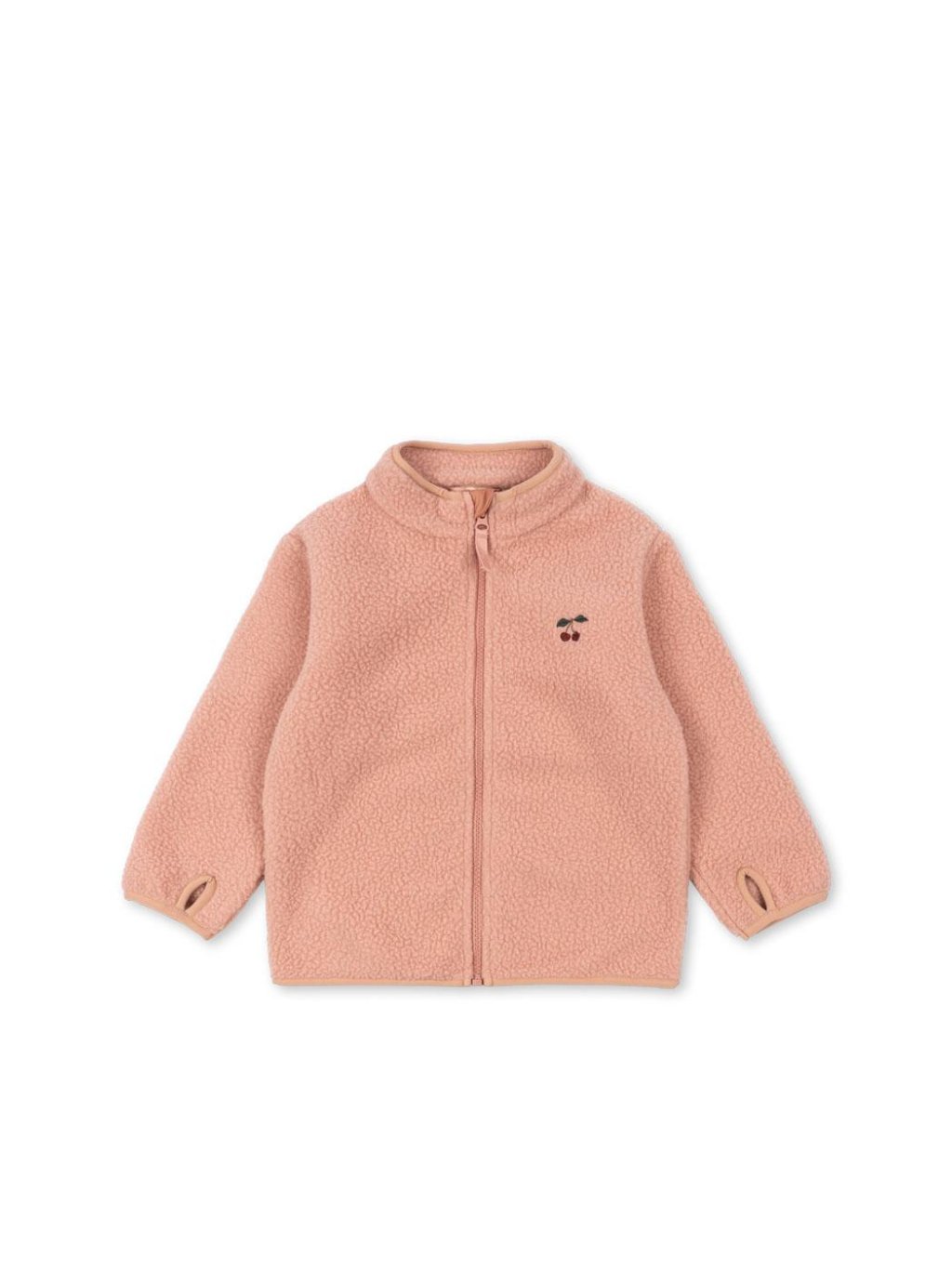 Dívčí rozepínací praktická fleecová mikina se zapínáním ke krku. Na rukávech má mikina otvory na palce, na levém prsu je decentní výšivka třešinky. Mikina je vyrobena z recyklovaného polyesteru, který je lehký a jemný, což je ideální pro nošení samostatně nebo jako další vrstvu pod tenkou bundu.