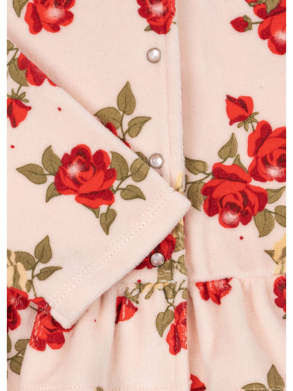 Dětská rozepínací mikina  s motivem květinek.  Mikina má u krku kulatý výstřih. Mikina je z velmi příjemného, heboučké, sametového materiálu. Na přední straně jsou ozdobné knoflíčky.