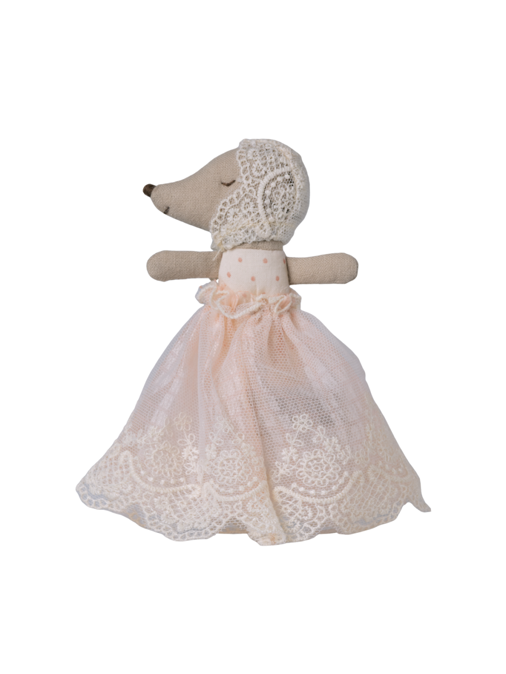 Tato malá myšička je oblečená do krásných, svátečních šatů s ozdobnou čepičkou plnou nádherných detailů.