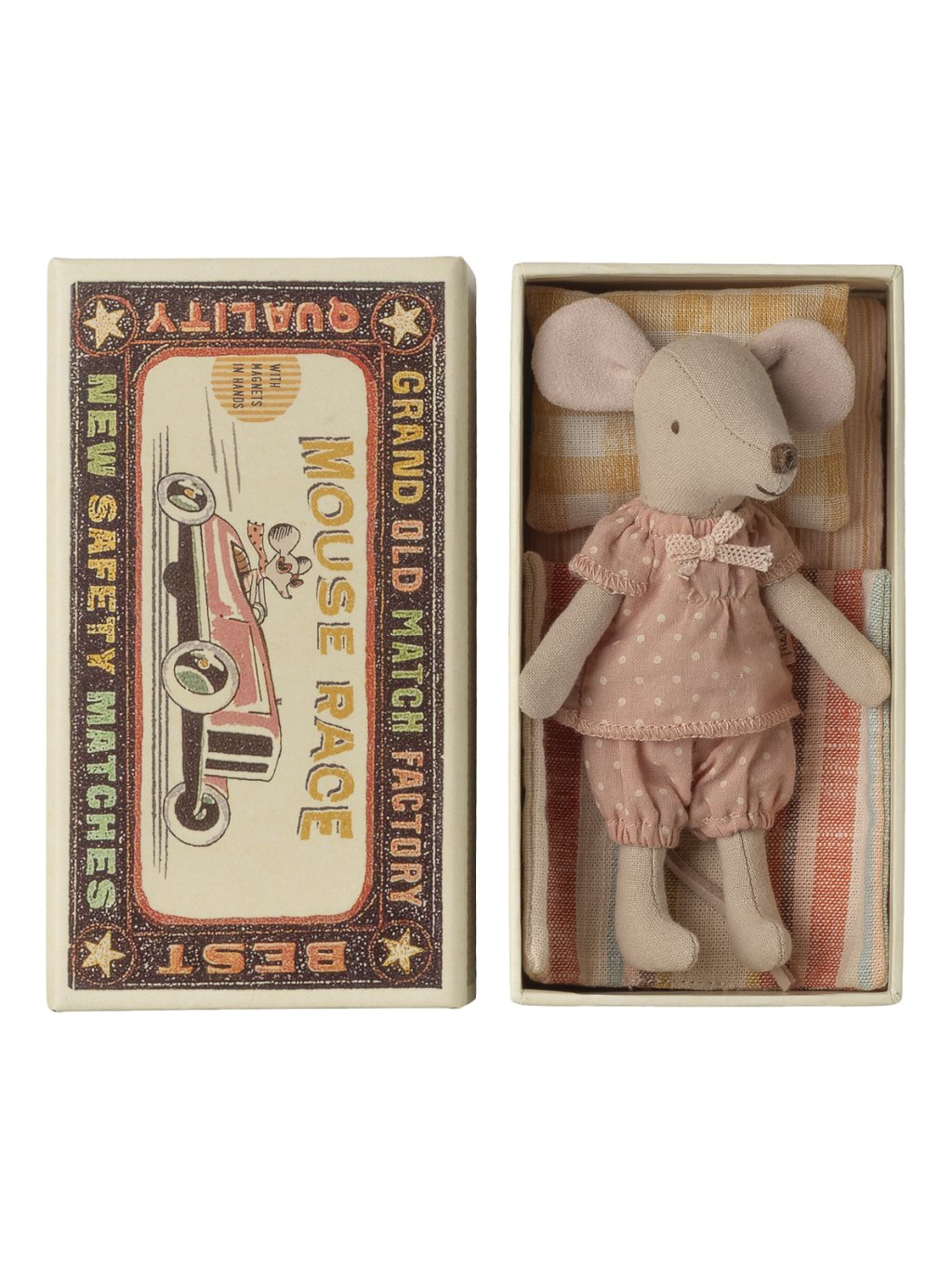Tato myška je připravena na hodiny hraní a spaní v krabičce od sirek. Oblečení a ložní prádlo jsou vyrobeny z bavlněných látek s jedinečnými tiskem v krásných barvách.