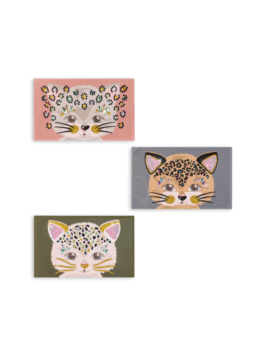 Sada nalepovacích kamínků na obličej ve tvaru kočičí hlavičky s oušky. V sadě jsou 3 různé druhy.