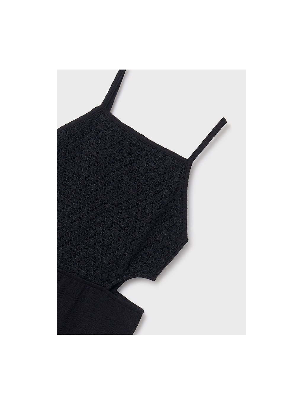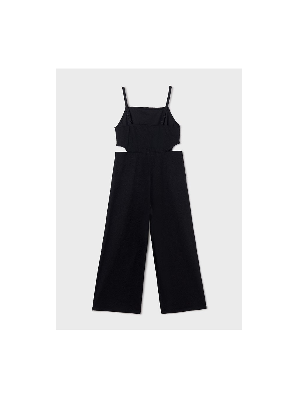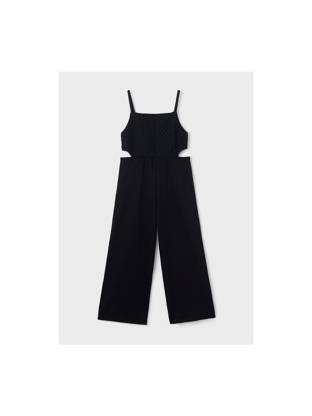 Mayoral dívčí bavlněný overal s průstřihy a háčkováním. Overal má špagetová ramínka a dlouhé zvonové nohavice. V oblasti prsou je háčkovaná aplikace a průstřihy na bocích. Overal je z velmi příjemného, lehoučkého materiálu.