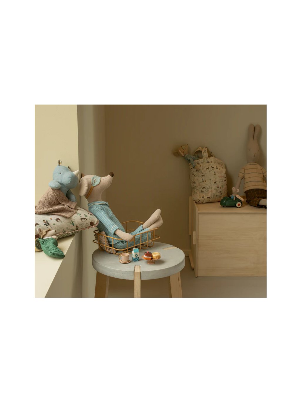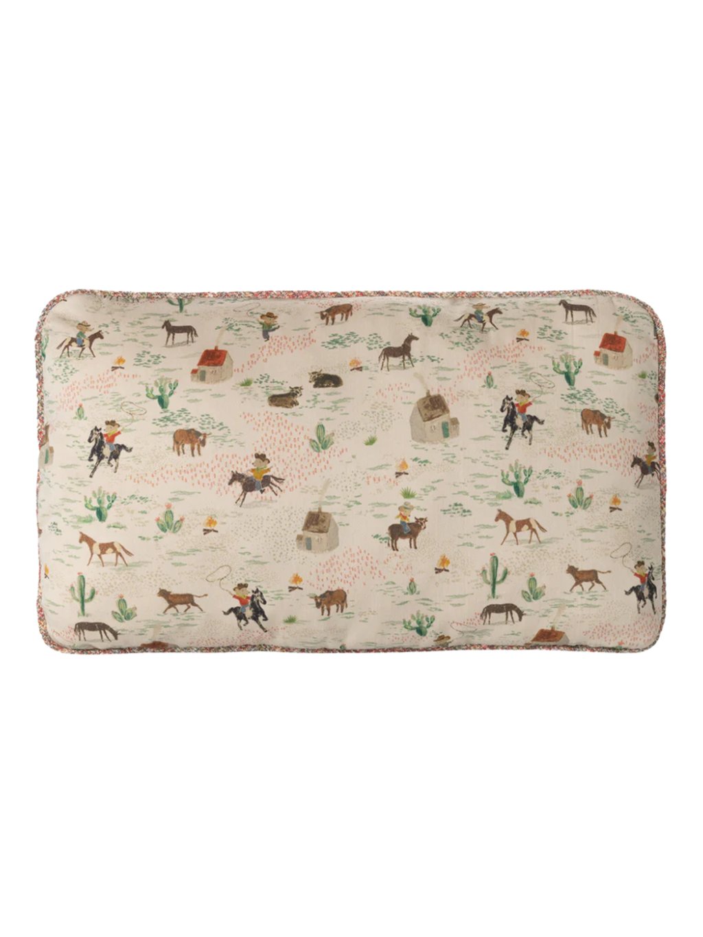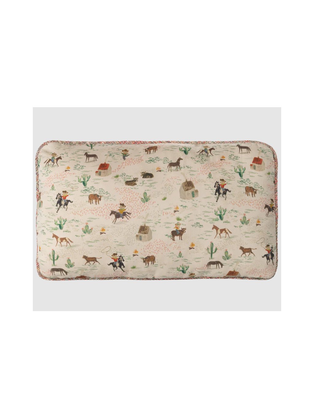 Obdélníkový oboustranný polštář má krásný, decentní motiv myšek a poníků. Polštář má spousty krásných detailů - jako je lemování, výběr materiálů nebo samotné šití, které dotvářejí celkový vzhled.