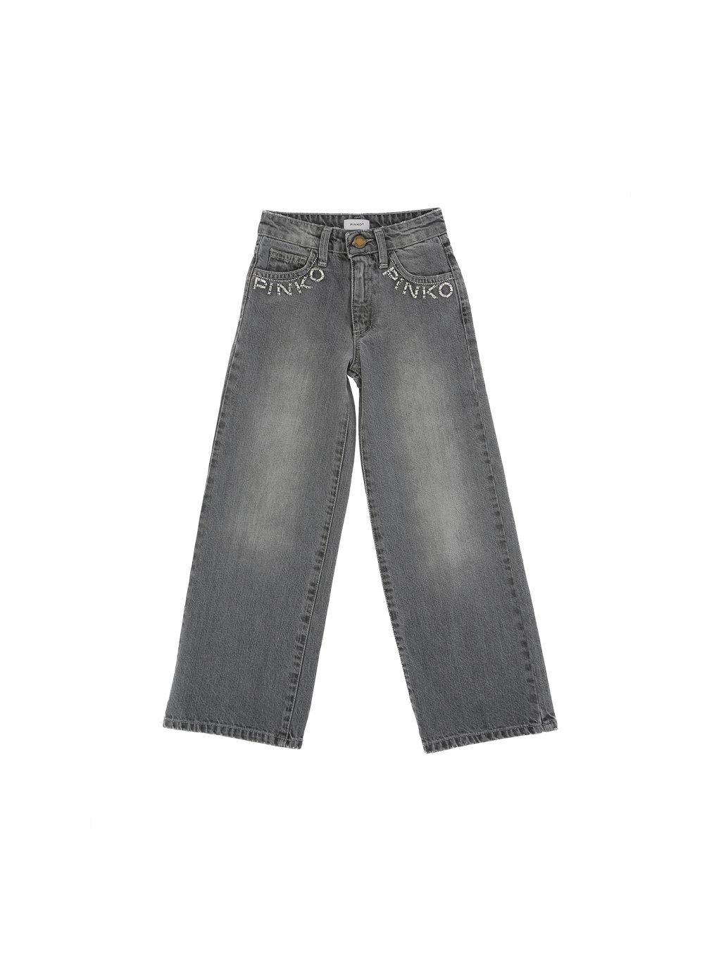 Dívčí široké rifle značky PINKO Up. Rifle jsou zvelmi příjemné rifloviny. Na přední i zadní straně jsou dvě funkční kapsy. Na přední straně u kapes jsou kamínky. Zapínání mají rifle na knoflík a zip.