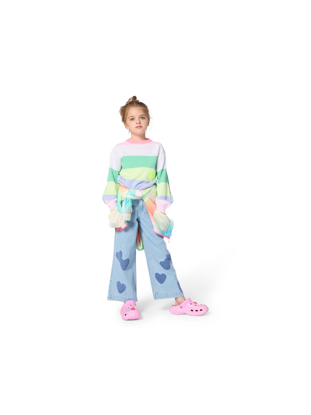 Dívčí rifle s motivem srdíček. Rifle mají široký střih a v pase regulační gumičky. Zapínaní mají na zip a knoflík. Rifle jsou praktické a stylové, hodí se pro každodenní nošení.