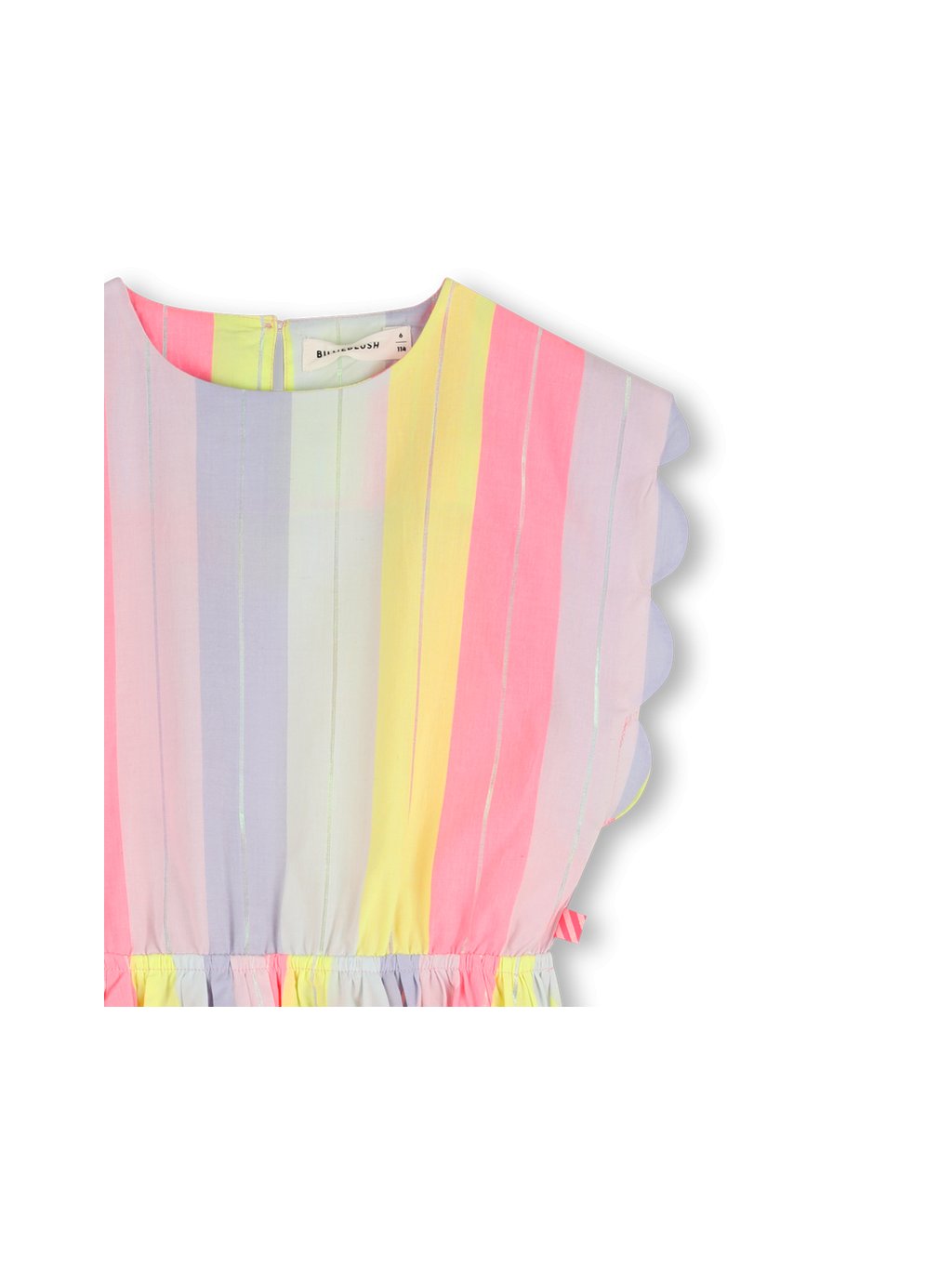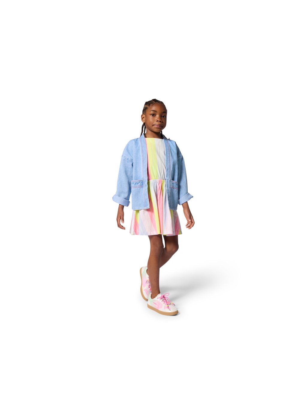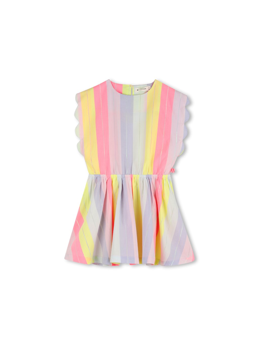 Dívčí barevné šaty. Krátké rukávy s mušličkovým lemováním a kulatý výstřih dodávají šatům jemný nádech, zatímco elastický pas zaručuje pohodlí a volnost pohybu. Zapínání na zadní straně ve tvaru kapky zajišťuje elegantní vzhled a snadné oblékání.