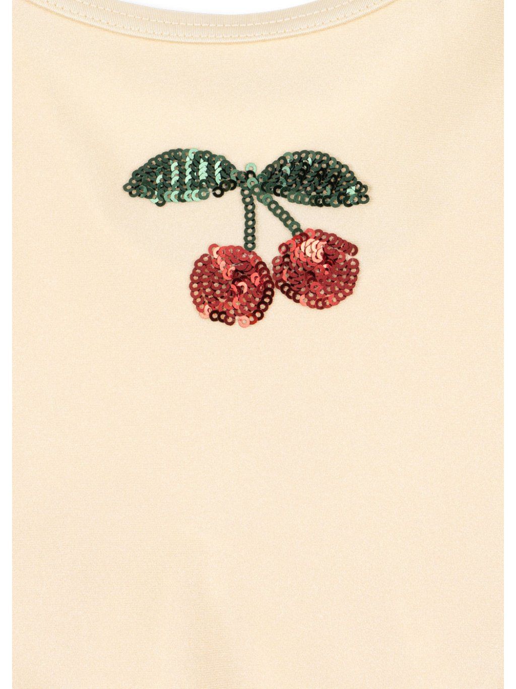 Nádherné dívčí šatečky se špagetovými ramínky a řasenou sukýnkou. Šaty jsou z lehkého, lesklého materiálu, na prsou mají šaty aplikaci třešně.