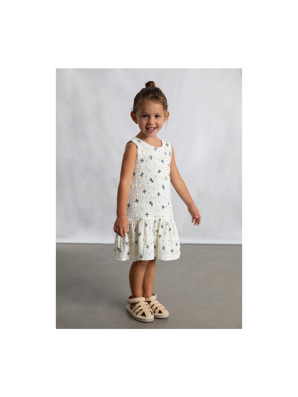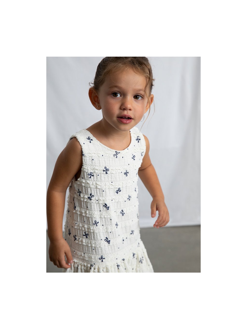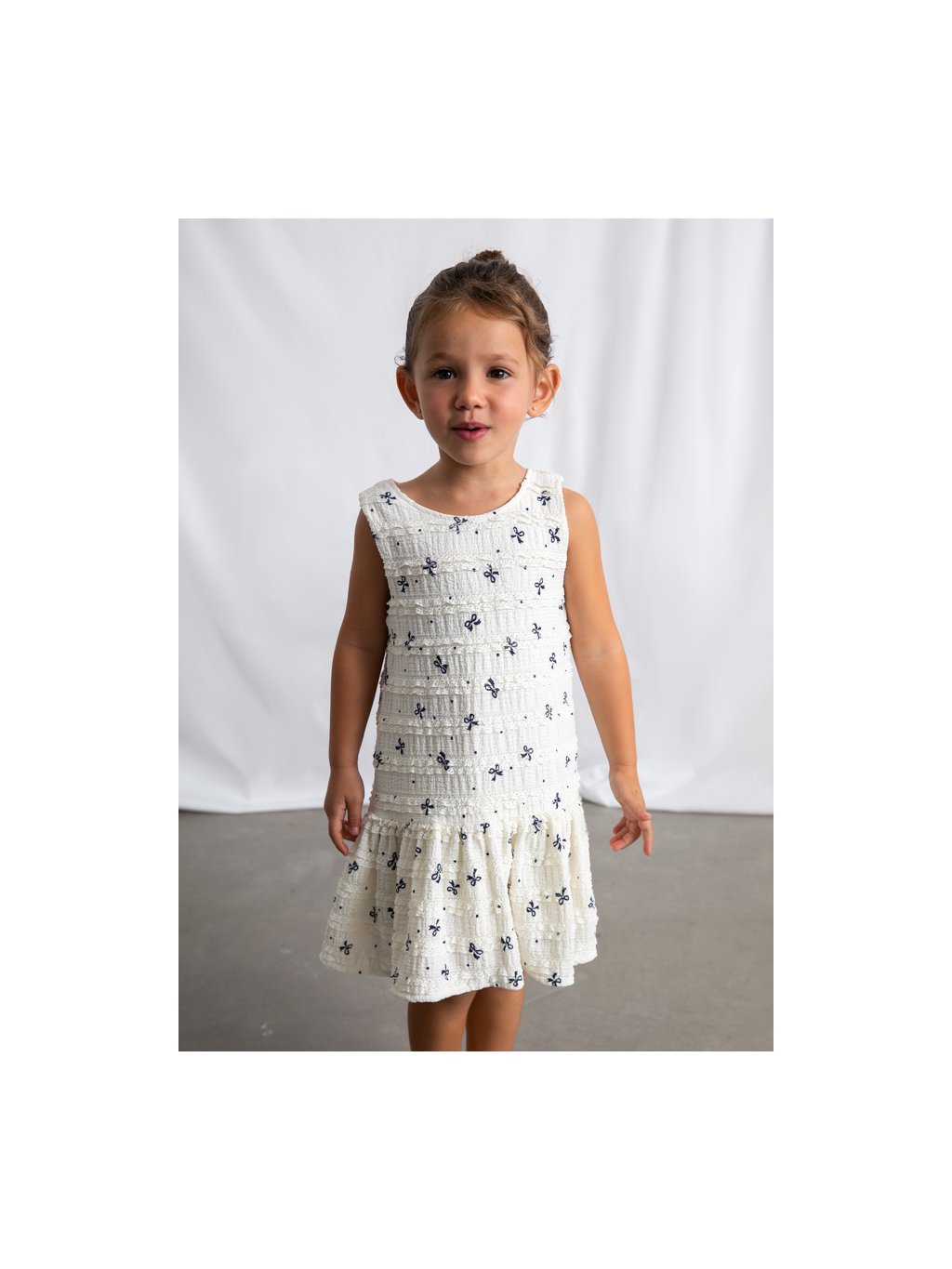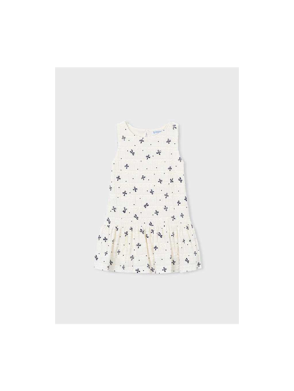 Mayoral dívčí šaty na široká ramínka s řasením a madeirou.  Šaty jsou z velmi příjemného, pružného materiálu. Šaty mají podšívku.  Po celé ploše je motiv mašliček. Sukně je kolová a krásně se točí!