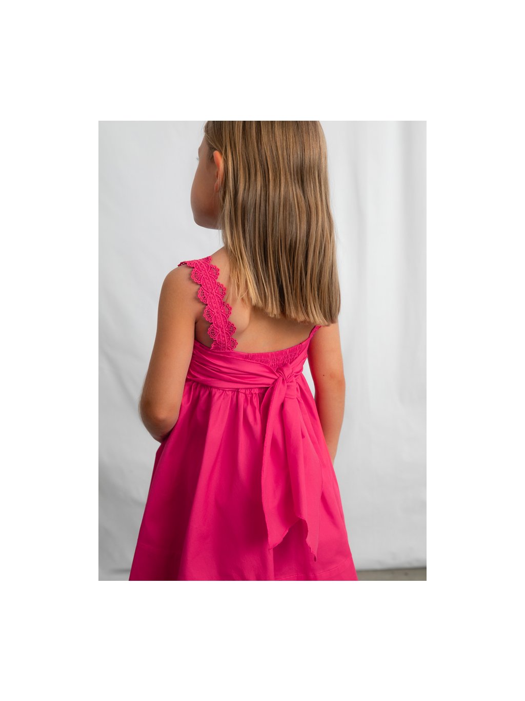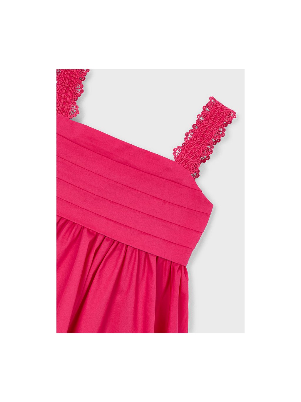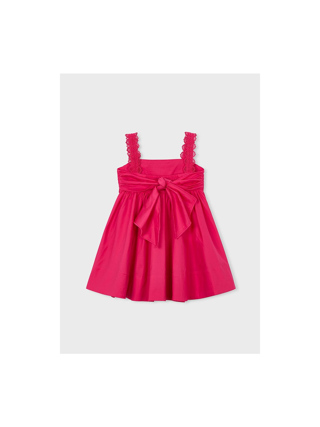 Mayoral dívčí šaty na ramínka v tmavě růžové barvě. Šaty mají krásná ozdobná ramínka. Zadní část šatů je krásně řešená. Zavazování na mašli dodává šatům šmrnc a možnost úpravy.