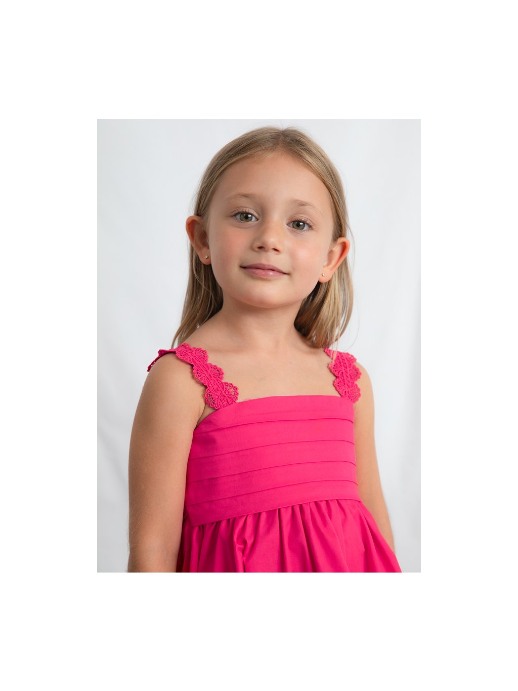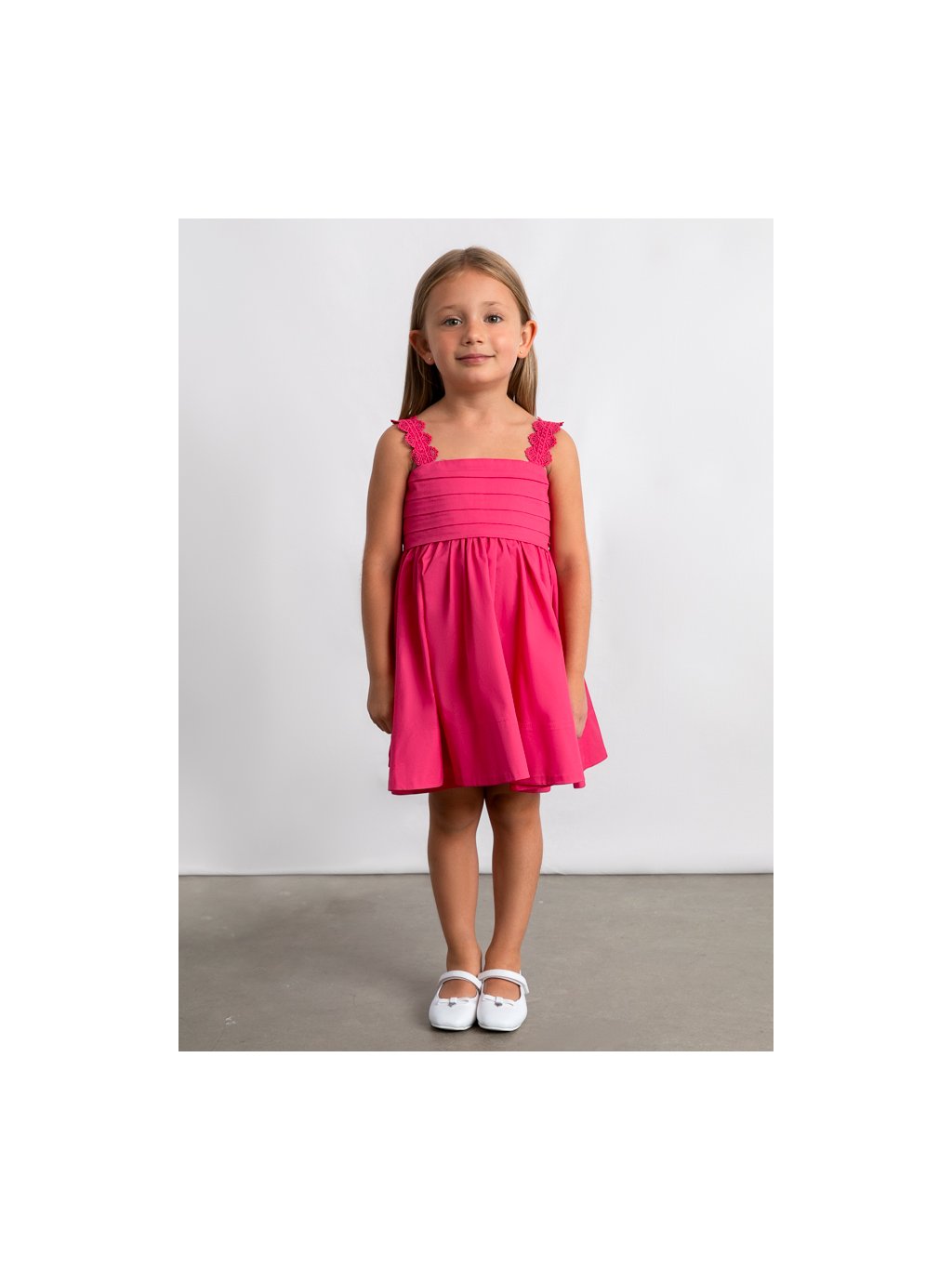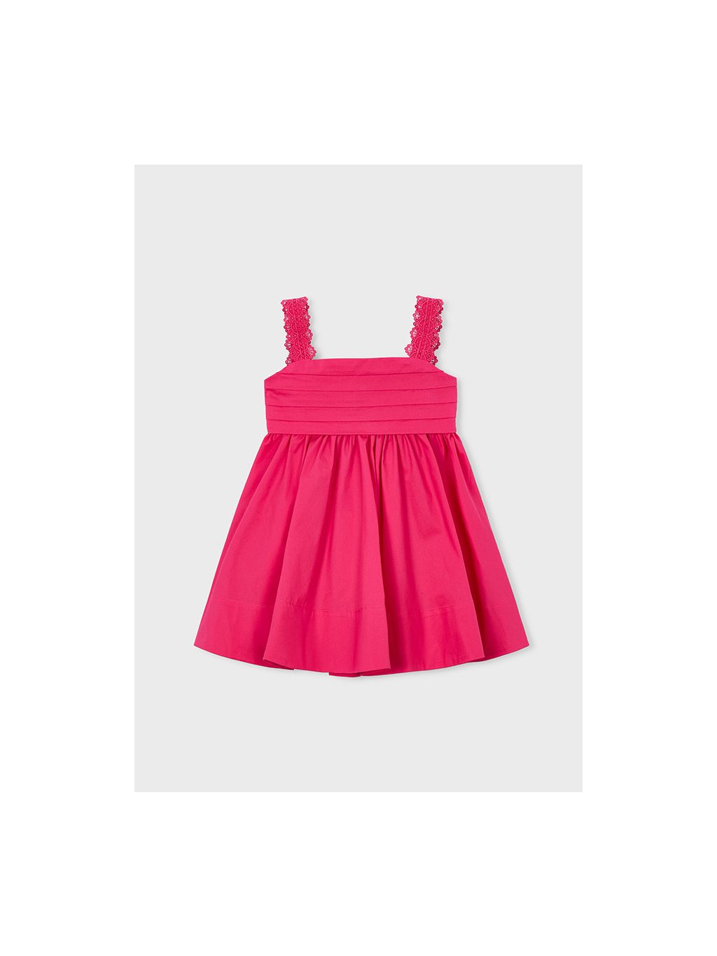 Mayoral dívčí šaty na ramínka v tmavě růžové barvě. Šaty mají krásná ozdobná ramínka. Zadní část šatů je krásně řešená. Zavazování na mašli dodává šatům šmrnc a možnost úpravy.