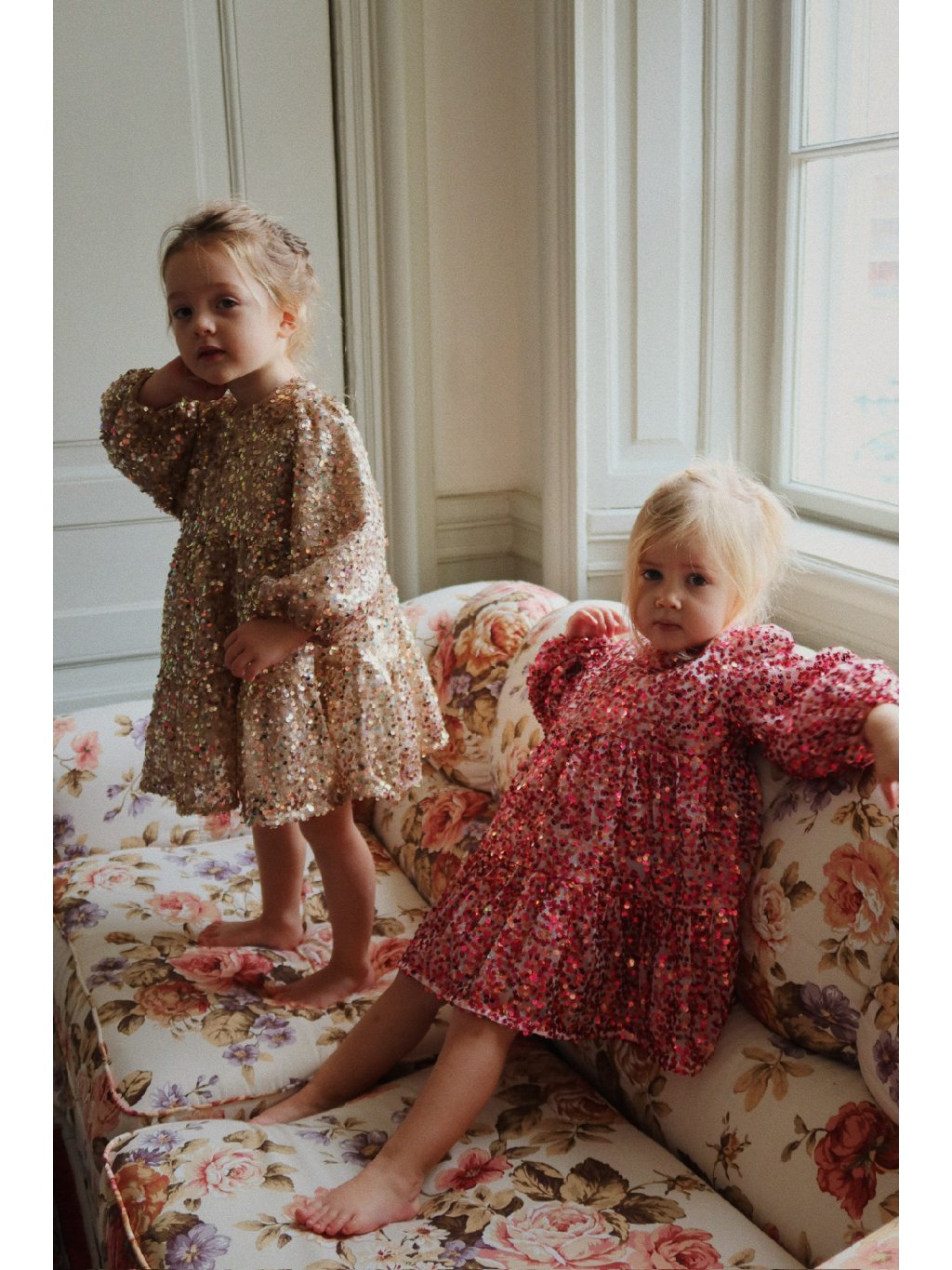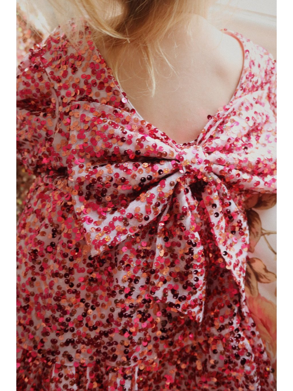 Nádherné šaty s dlouhým rukávem a třpytivými flitry. Šaty mají dlouhý rukáv, mají bavlněnou podšívku, a u krku je kulatý výstřih. Rukávy jsou balónové a lehce nabírané. Na zadní straně je velká mašle s flitry.