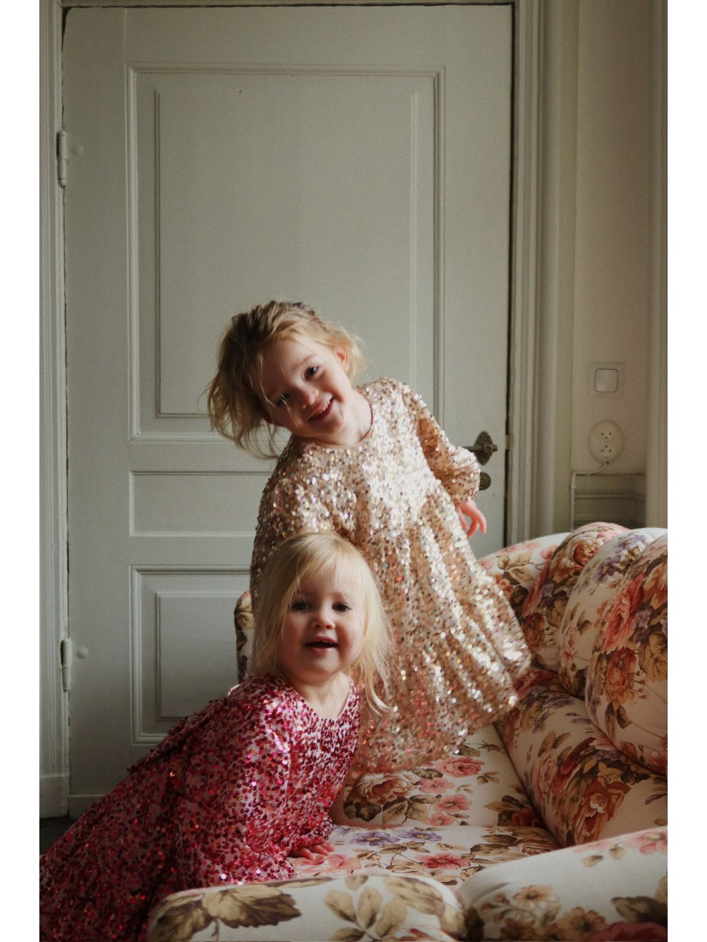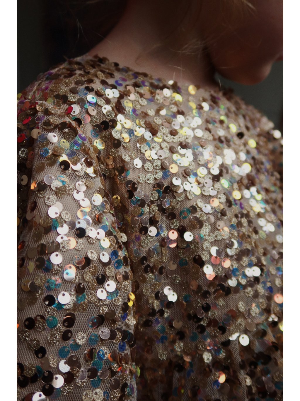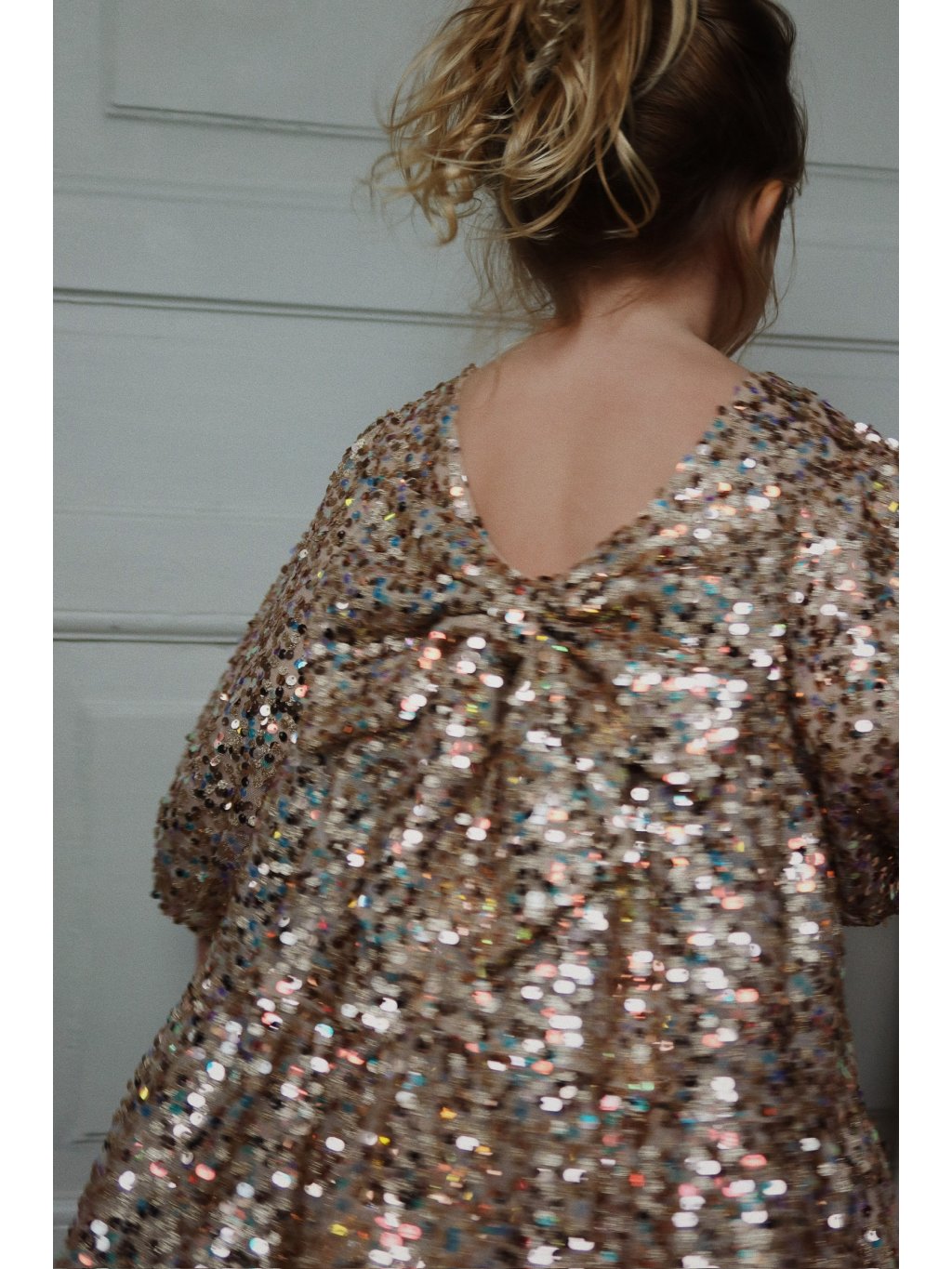 Nádherné šaty s dlouhým rukávem a třpytivými flitry. Šaty mají dlouhý rukáv, mají bavlněnou podšívku, a u krku je kulatý výstřih. Rukávy jsou balónové a lehce nabírané. Na zadní straně je velká mašle s flitry.
