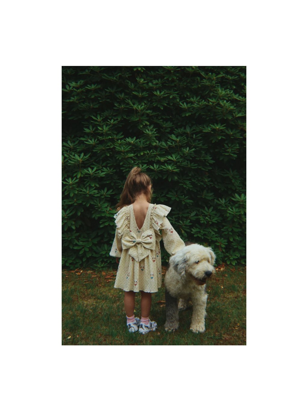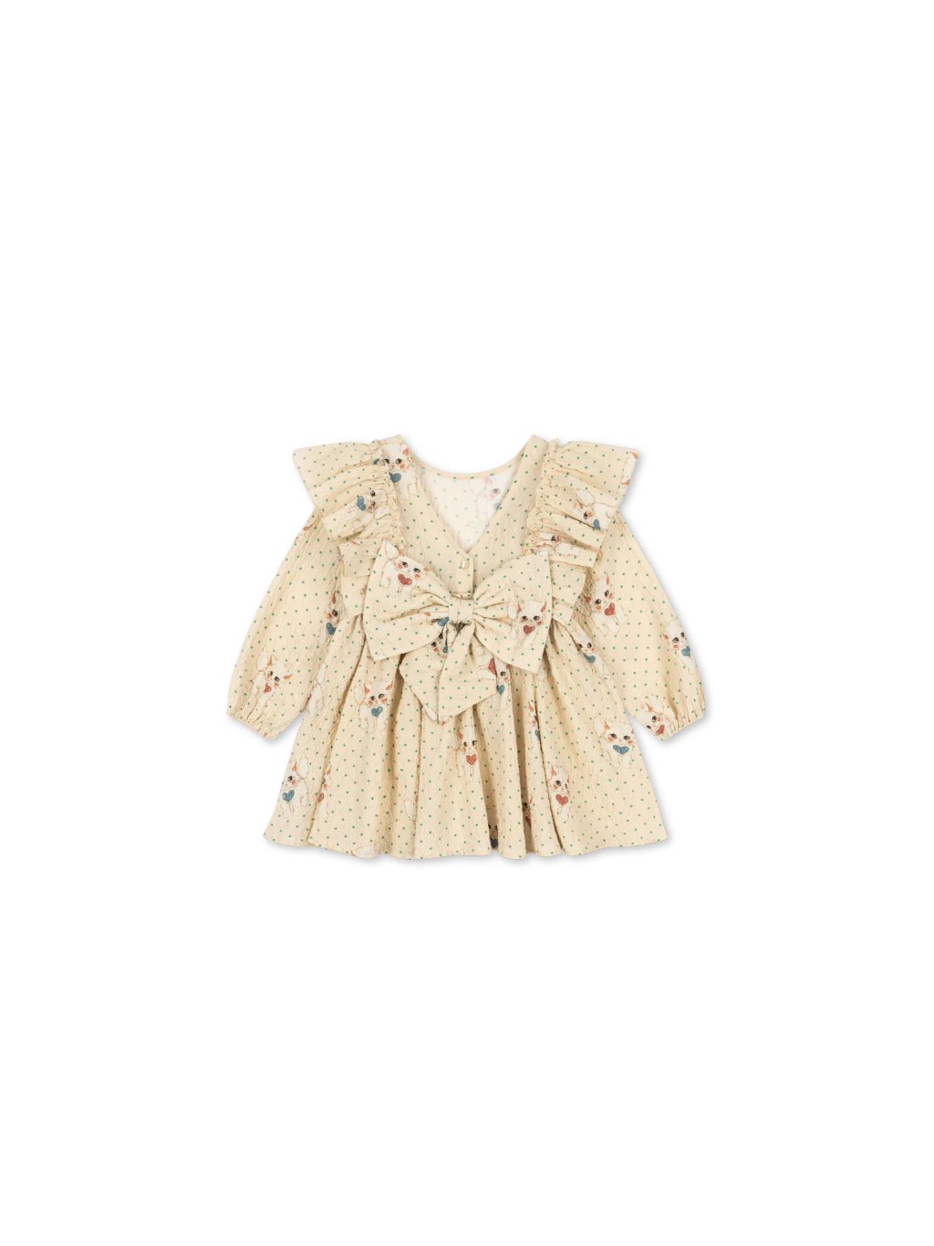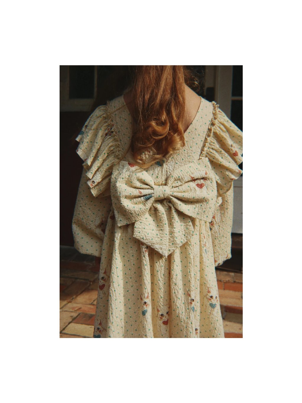 Nádherné dívčí šaty s mašlí na zadní straně a motivem baletek. Šaty jsou z velmi příjemného matriálu, jsou vhodné na každodenní nošení. V oblasti prsou mají volány, na zadní straně jsou knoflíčky na zapínání s velkou mašlí.
