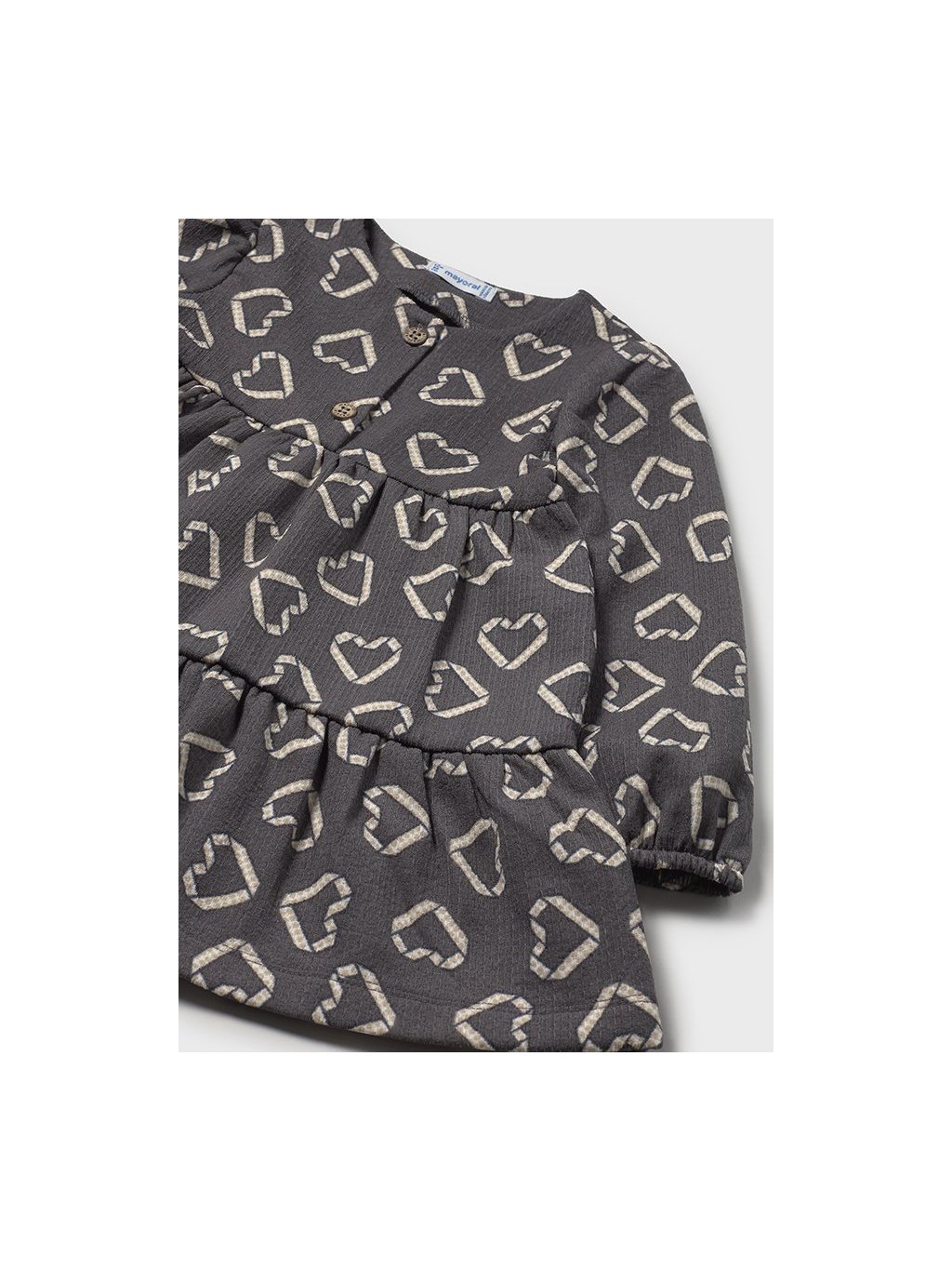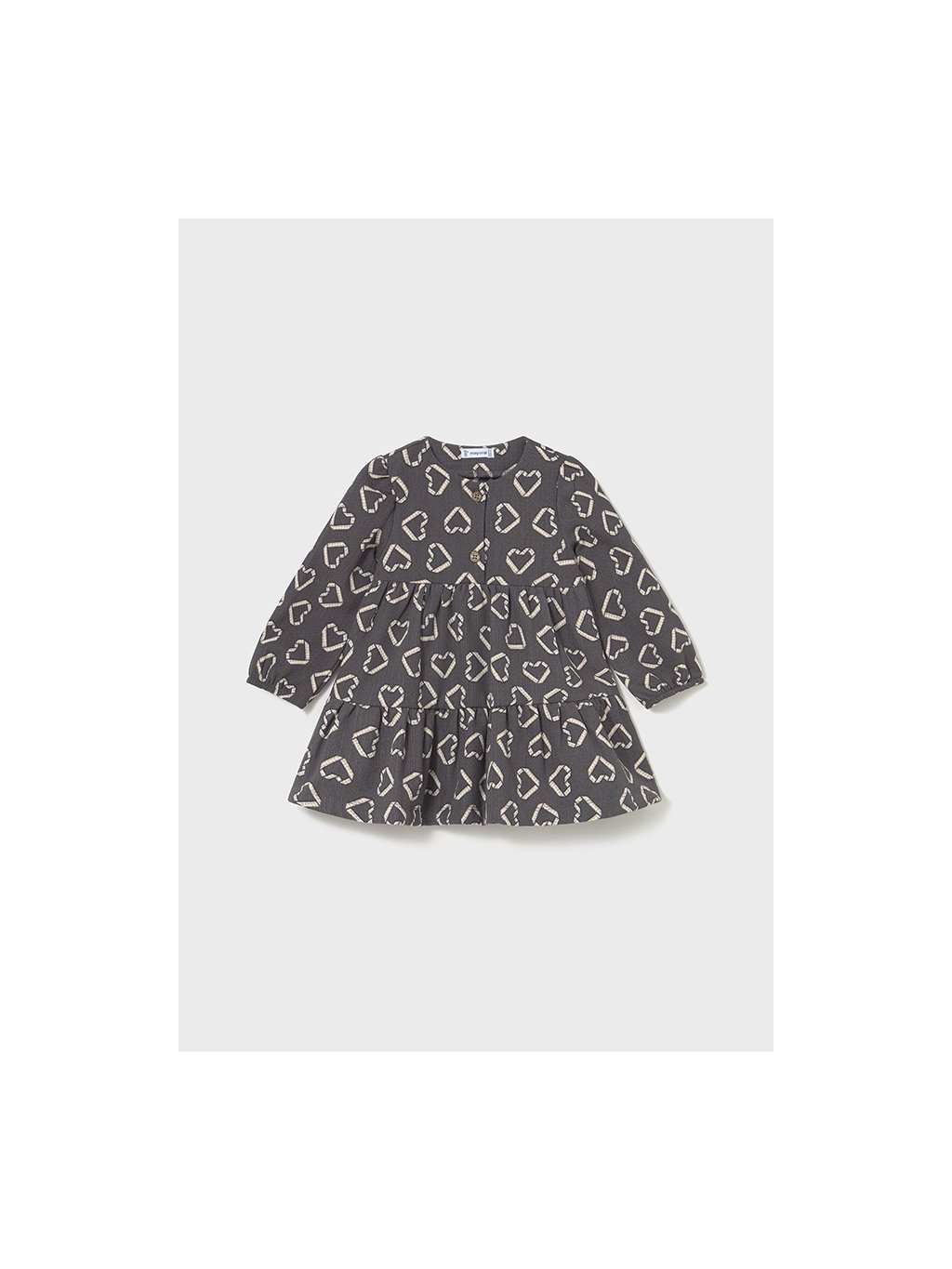 Mayoral dívčí šaty s dlouhým rukávem a motivem srdíček. Šaty jsou z v příjemného materiálu, na přední straně jsou knoflíčky pro snadnější oblékání. Šaty mají střih do "A".