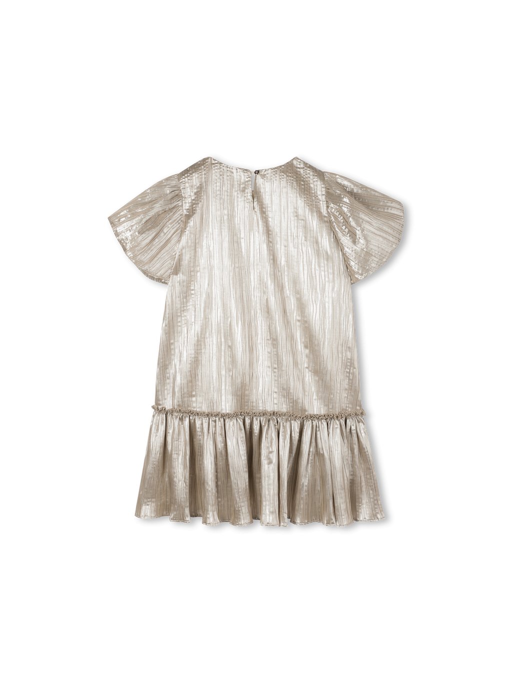 Luxusní dívčí zlaté šaty s nabíranými rukávy. Šaty mají u krku kulatý výstřih, krátké nabírané rukávy. Šaty mají na zadní straně zapínání na knoflíček a podšívku z hedvábné bavlny.