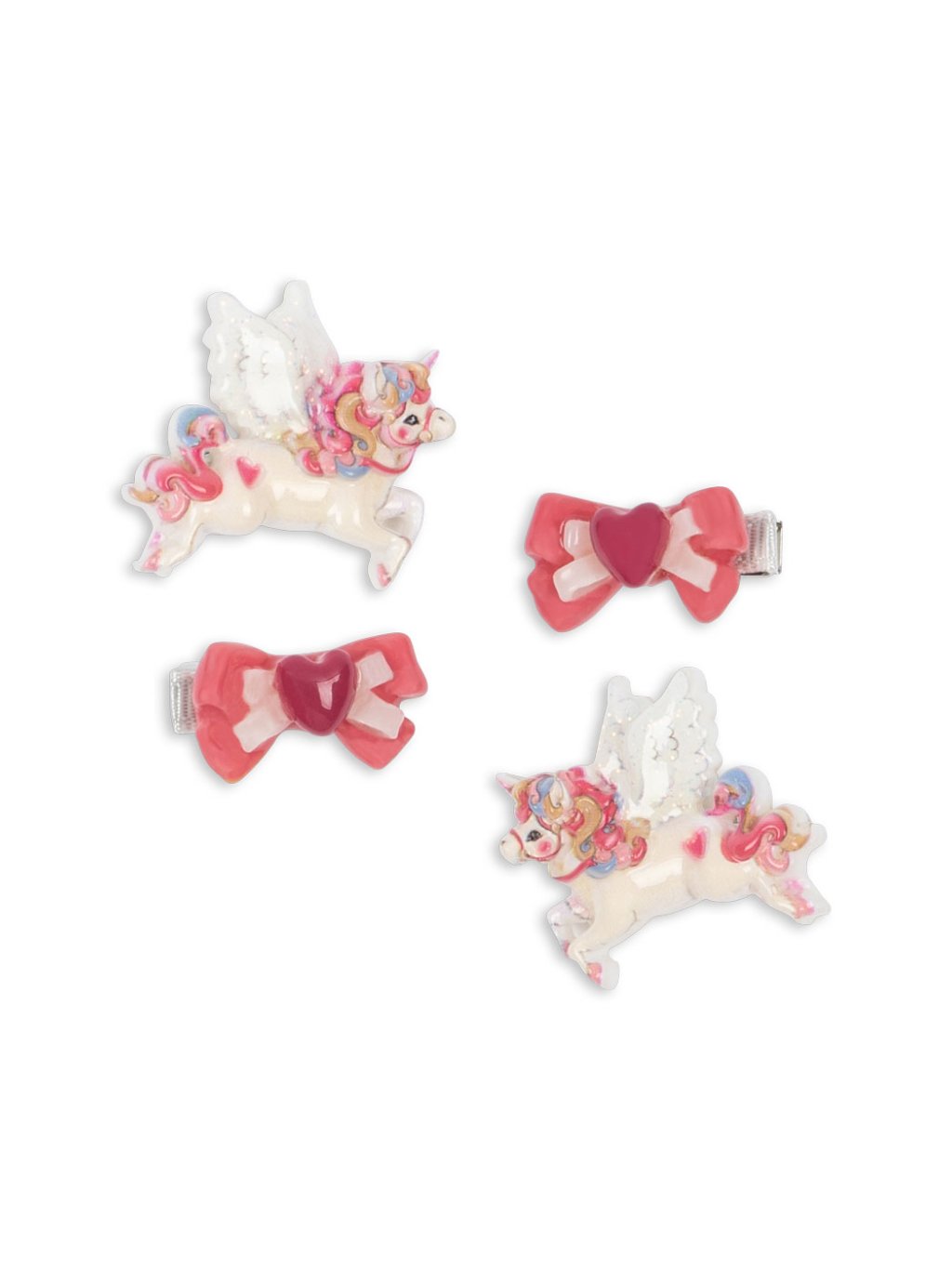 Sada 4 sponek s motivem jednorožce a mašliček. Tyto sponky ve vlasech dodají vašemu outfitu něco extra.