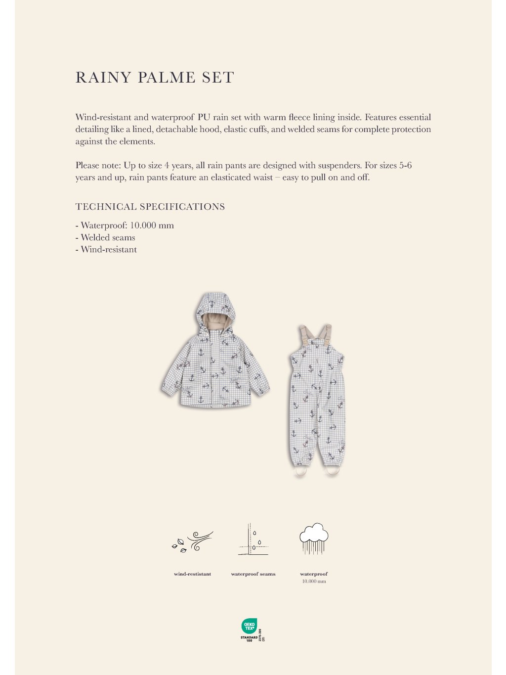 Nádherná větruodolná a voděodolná souprava do deště s hřejivou fleecovou podšívkou uvnitř. Kapuce je odnímatelná se zapínáním na cvoky. Elastické manžety na rukou a nohou zajišťují, že souprava do deště zůstane pevně na svém místě. Bunda má boční kapsy a zapíná se na zip a knoflíky. Bunda i kalhoty mají uvnitř praktické poutko na ramínko.