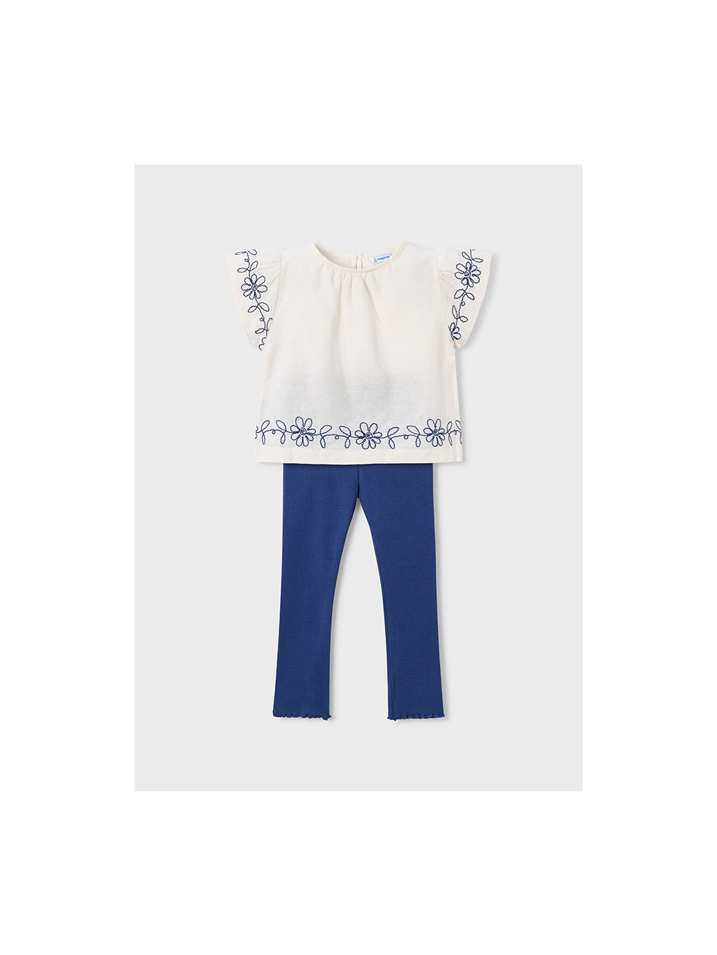 Mayoral dívčí souprava halenky s krátkým rukávem a legínek. Set je z velmi příjemného bavlněného materiálu. Halenka je zdobená vyšívanýma kytičkama.