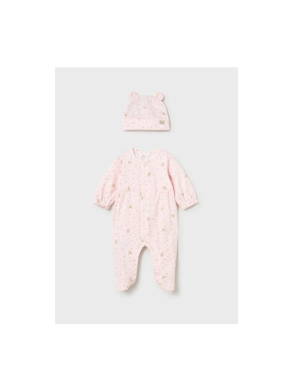 Mayoral kojenecký overal s čepičkou. Overal je z velmi příjemného bavlněného materiálu, tisk je po celé ploše overalu. Overal má zapínání na přední straně na cvoky, stejně tak jsou na přední straně kapsy. Čepička je součástí.